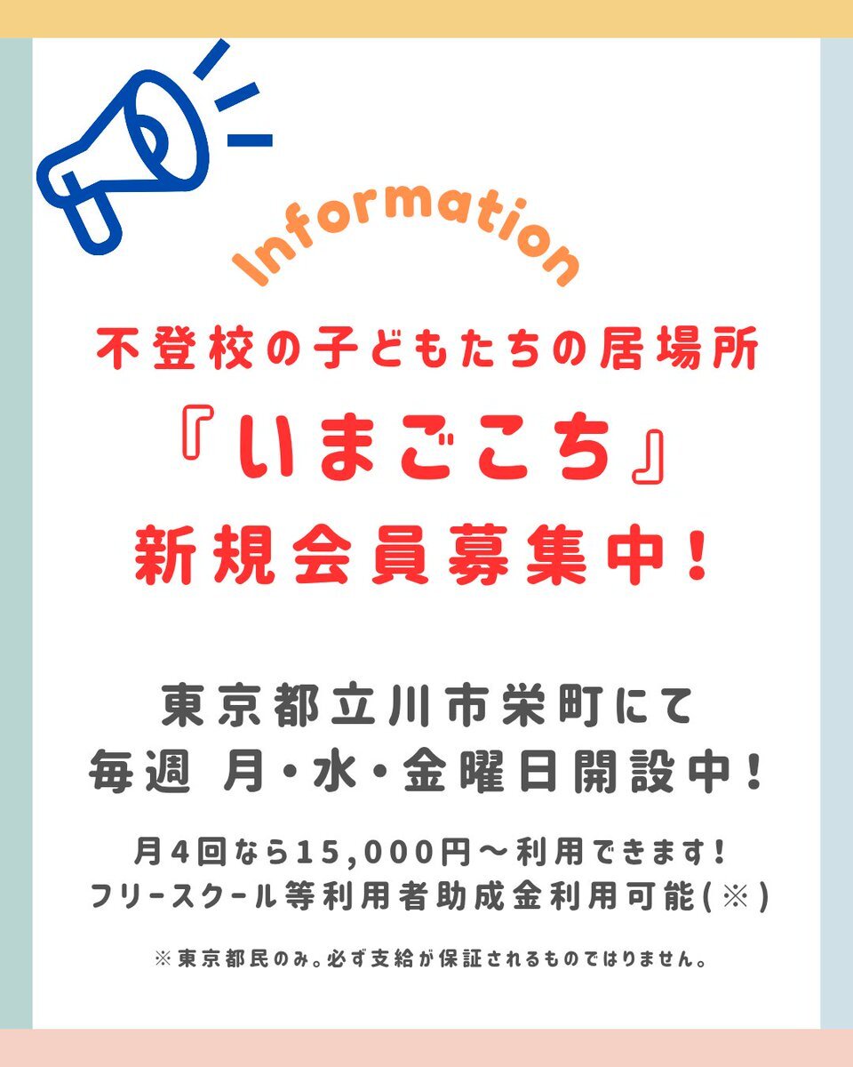居場所『いまごこち』の新規会員様は随時募集中! 落ち着いた環境で好きなことに取り組みながら、元気に自分らしく過ごせるようにサポートします😊 #不登校 #居場所 #立川市 pic.x.com/s2bXIOnHei