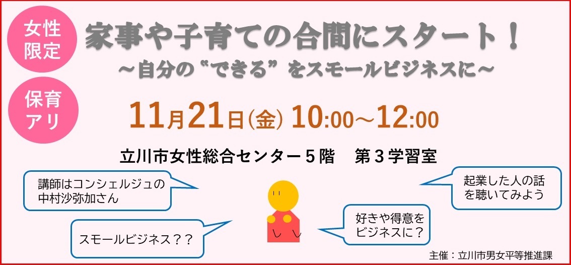 【起業講座】家事や子育ての合間にスタート!~自分の ‟できる”をスモールビジネスに~ city.tachikawa.lg.jp/sangyo/shokogy… #立川市 pic.x.com/makHjE8TTb