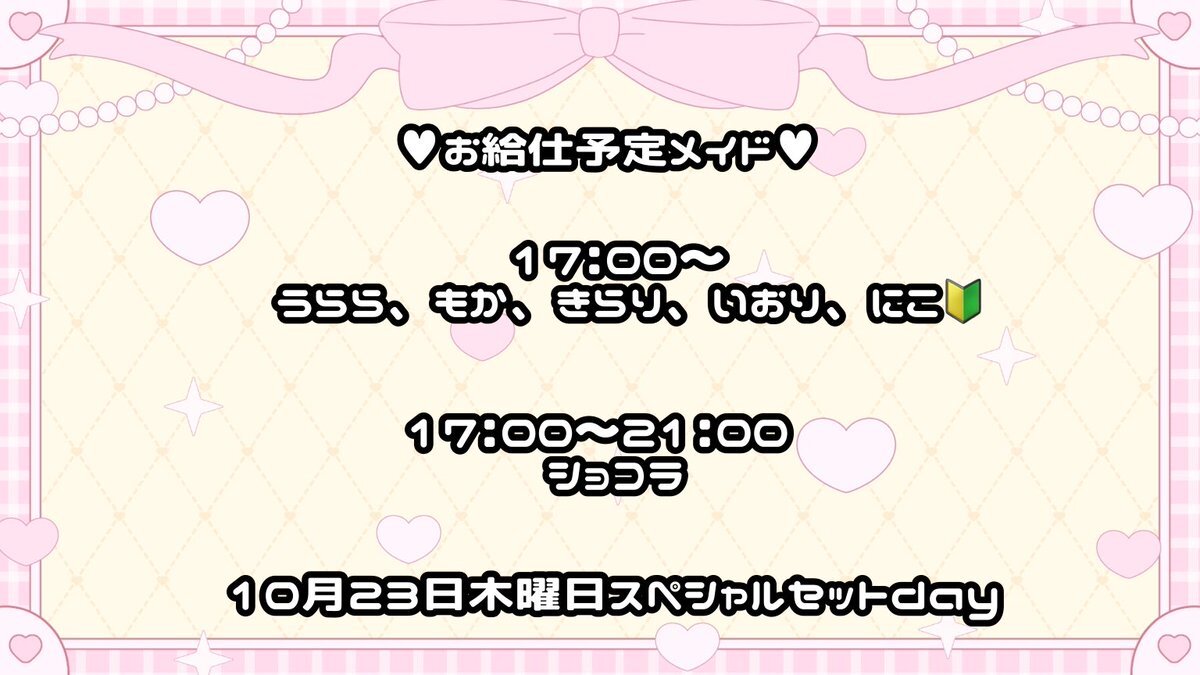 ♥お給仕予定メイド♥ 10/23(木) 17:00〜 うらら、もか、きらり、いおり、にこ🔰 17:00〜21:00 ショコラ @LO_V_ec @mokachi_HeaRTS @kirarini51 @iori__0708 @nicorun_0122 @__chocolatdoll #HeaRTS劇場 #メイドカフェ #立川 #カフェ #ドンキホーテ pic.x.com/anoS6HGFv9