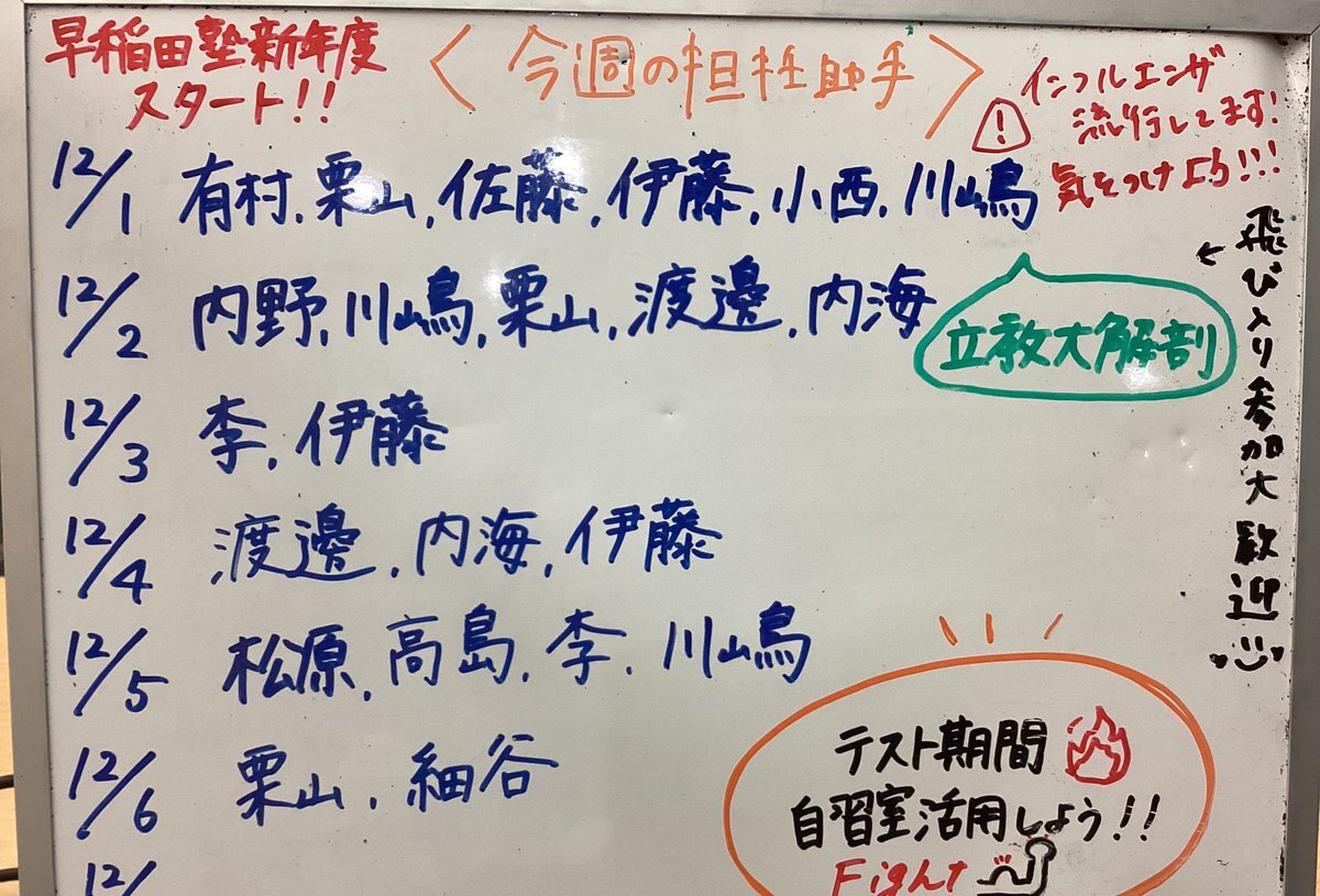 12月1週目の担任助手です! テスト期間の塾生が多いと思います📚是非自習室を利用しに来てくださいね♪全力で応援しています📣 #早稲田塾 #早稲田塾津田沼校 #大学受験 #総合型選抜 #現役合格 #AO入試 #新年度 #立教 pic.x.com/vhU3jznVFG