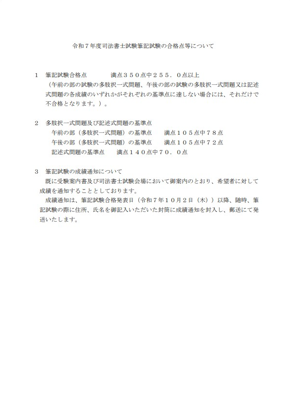 【速報】令和7年度司法書士試験筆記試験 結果 ・筆記試験合格点 255点/350点(昨年267点) -各基準点- ・午前:78点/105点(昨年78点) ・午後:72点/105点(昨年72点) ・記述式問題:70点/140点(昨年83点/140点) その他詳細は添付画像をご確認ください。 #司法書士 #筆記試験 #司法書士試験 pic.x.com/vAiffSYLBI