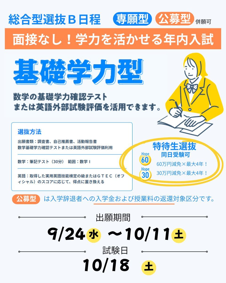 《出願受付中!》 ✍総合型選抜 B日程  ○ 基礎学力型 ← 面接なし  ○ 特色PR型 ← 面接あり ☝年内入試特待生にもチャレンジできる ☝公募型は併願可 詳しくは特設ページで niit.ac.jp/nyuushi/index.… #新潟工科大学 #入試 #総合型選抜 #筆記試験 #学力テスト #特待生 pic.x.com/9PHn3h97Fw
