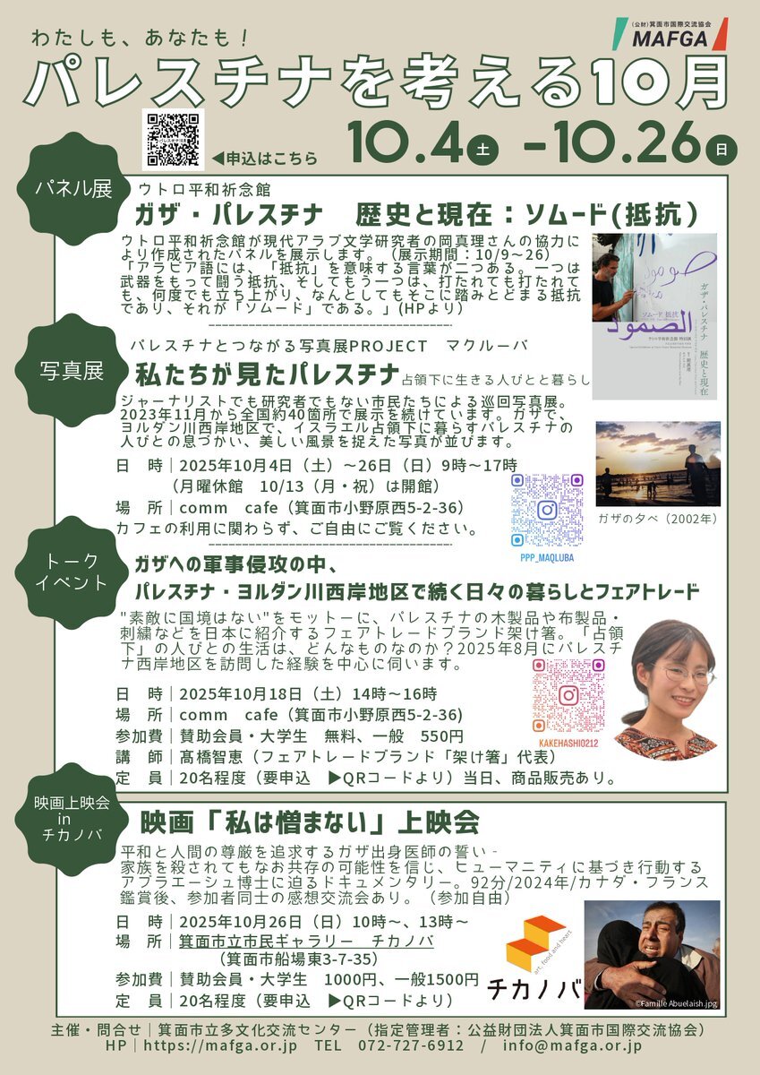 【#タッキーCネットだより】 ☎#箕面市国際交流協会 末原真紀さん 📍パレスチナについて考える10月について 10/26㈰まで、パネルや写真展、トークイベント、映画上映を開催。世界の平和を考え行動するための月間として実施中。ぜひお越しください。 #箕面 #mafga #パレスチナ pic.x.com/YMUxg1O37t