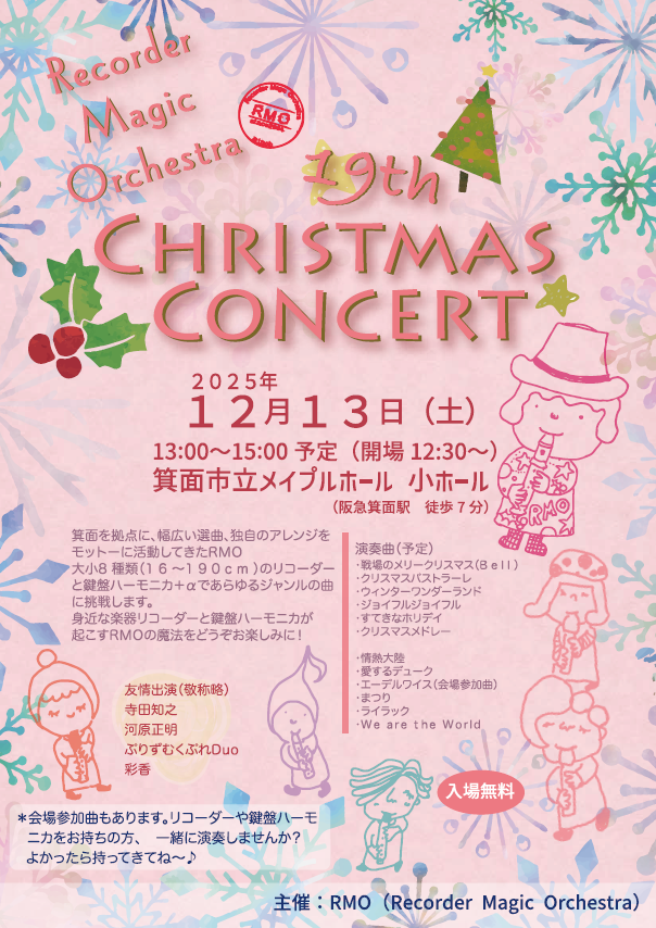 事後報告となりますが💦 20025.12.13 RMOクリスマスコンサート 無事終了いたしました。 会場に足をお運びくださったみなさま ありがとうございました。 来年も楽しい(面白い)時間となるよう 精進します。これからもよろしくね。 #RMO #リコーダーアンサンブル #箕面 #リコーダーマジックオーケストラ pic.x.com/ZBBBL9Ajii