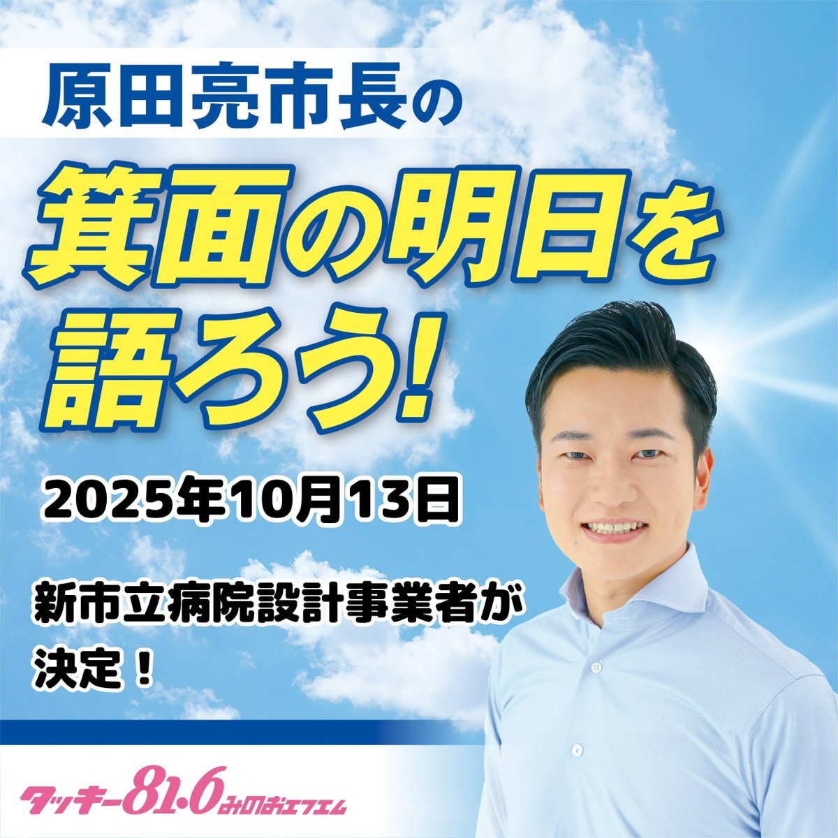 #原田亮市長の箕面の明日を語ろう! わがまち箕面のリーダー原田亮市長にインタビュー! 箕面の「明日」が一番わかる! 10/13は「新市立病院設計事業者が決定」などを伺っています。 毎週月曜16:27/火曜11:30みのおエフエムで放送 アーカイブは→ minoh.net/minoasu/list.p… #minoh #箕面 #原田亮 pic.x.com/4RbSLOWP6O