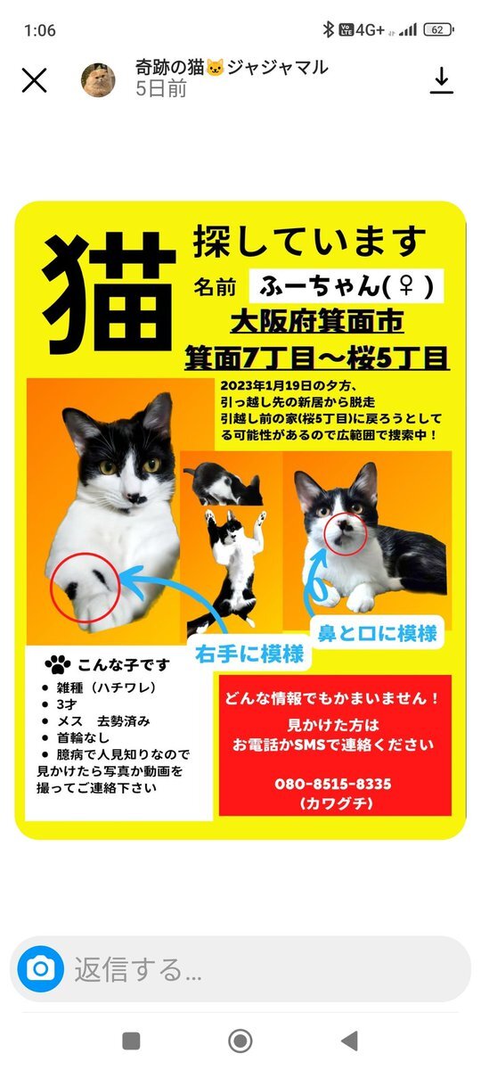 #拡散希望 🙏ご存知の猫ちゃんに似たコいませんか❓️ 【#大阪府迷子猫】 #ハチワレ猫迷子 🐱ふーちゃん🐱 #迷子猫 #保護猫 🟡2023/1/19迷子 #大阪府 #箕面市 #箕面 7丁目 ⚠️引越し前の家がある #箕面市桜 5丁目付近の可能性有 📢#目撃 #保護 等や些細な事でもあればご連絡を🙇 x.com/chami3697/stat…