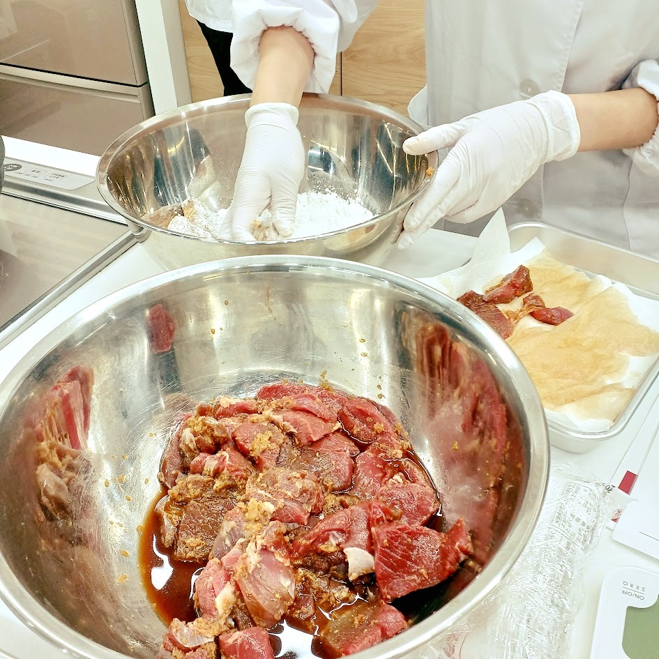 昨日の続き。 #ジビエ給食 🦌には #エゾシカ肉の竜田揚げ🦌もおすすめ! 調味液をペーパーで拭き取って(重要)、片栗粉をまぶしてギュッと握る(重要)。 会場中に揚げ物祭りの音が響く! #エゾシカ給食セミナー(北海道主催)より @eiyolabo #えいようラボラトリ合同会社 #管理栄養士 #シカ肉博士🦌 #PhD pic.x.com/IUyj5hv3r7