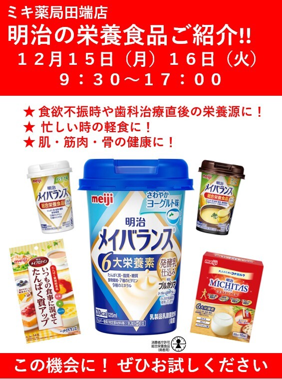 【✨イベント✨】 #ミキ薬局 #田端 店では #メイバランス など #明治 の栄養食品の 紹介イベントを行います!! 処方箋なしでもお気軽にお立ち寄りください😊 📍ミキ薬局田端店 ⏲12/15-12/16 9:30~17:00 miki-ph.jp/mikinews/2025/…