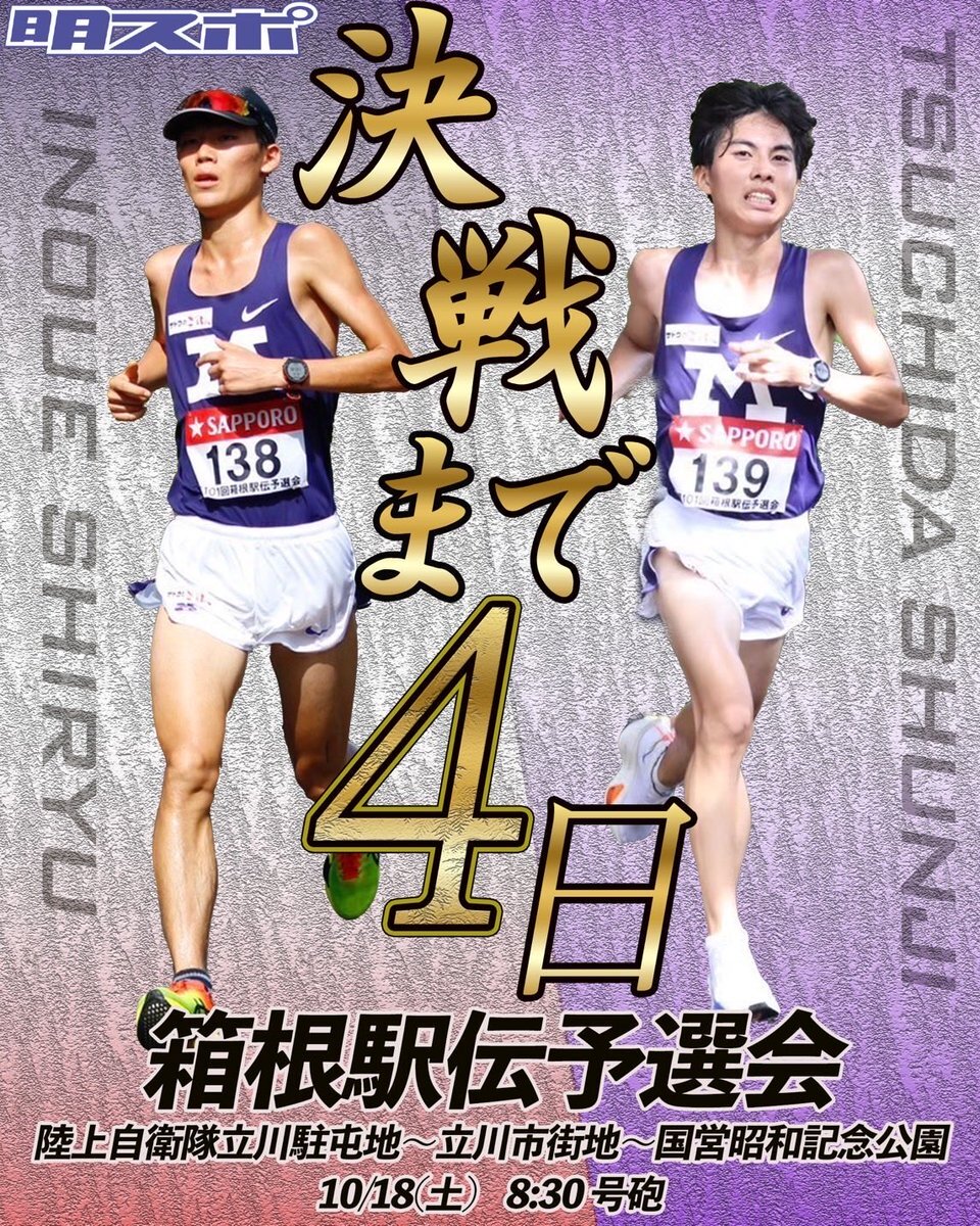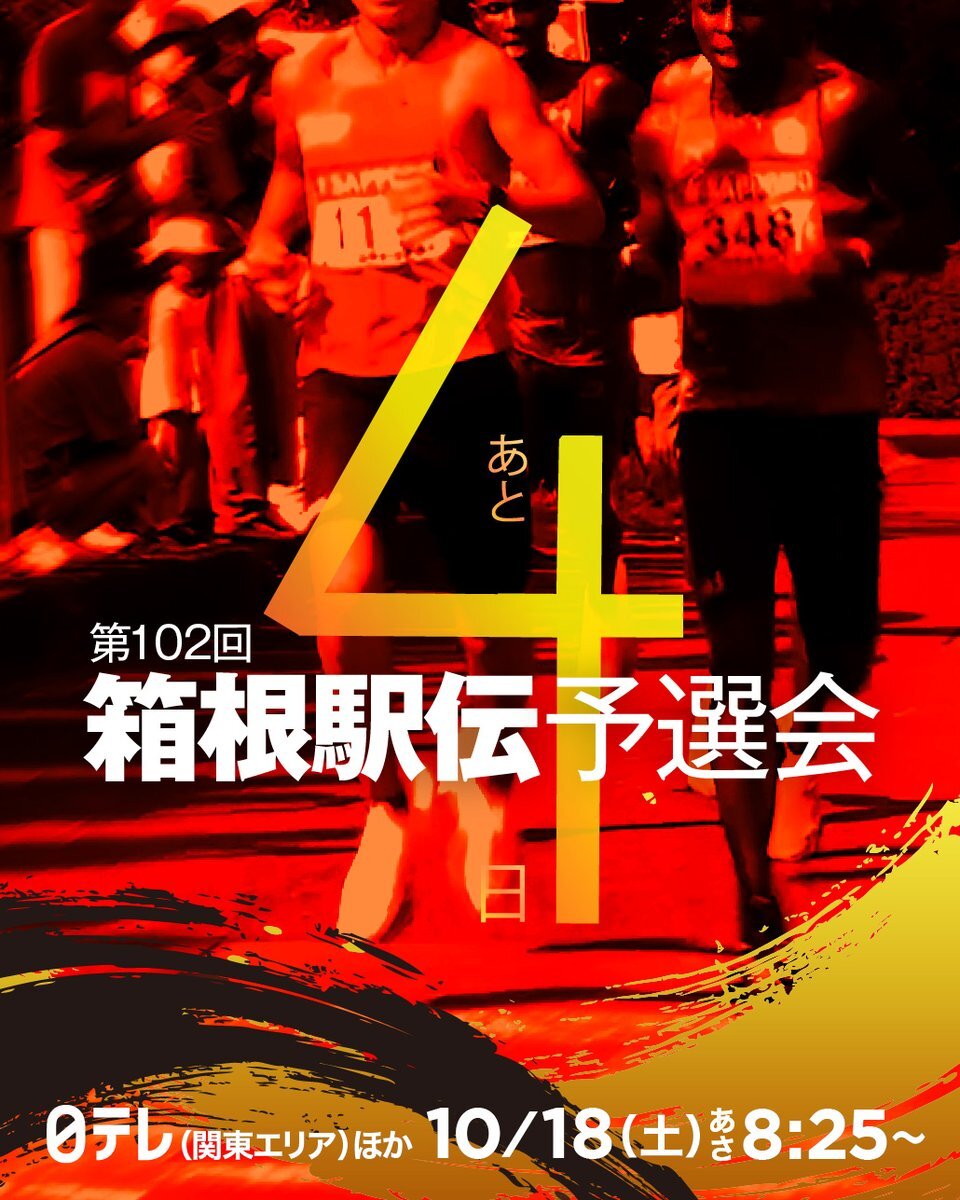第102回 #箱根駅伝予選会 まで ≪≪≪≪≪≪≪ あと4⃣日🏃♂️ ≪≪≪≪≪≪≪ 🗓️10月18日(土)あさ8時25分〜 日本テレビ(関東エリア)ほかで生中継📡 TVerでもライブ配信⚡️ ✅Instagramでも情報をお届けしています📲 instagram.com/hakone_ntv/ pic.x.com/xRkCKSTIhO