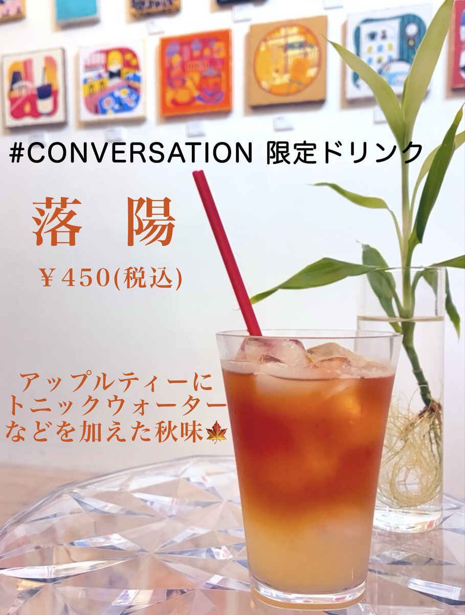 明日からの個展、二人展、ともに限定ドリンクが出ます✨️ #CONVERSATION ではアップルティーをベースにトニックウォーターなどを加えた大人の秋味ドリンク 『 落陽 』 #猫と子どもの町 では甘すぎないオリジナルブレンドのミックスジュース! 『 おしゃまジュース 』 どちらも450 円です✨️ x.com/isshikishoten/…