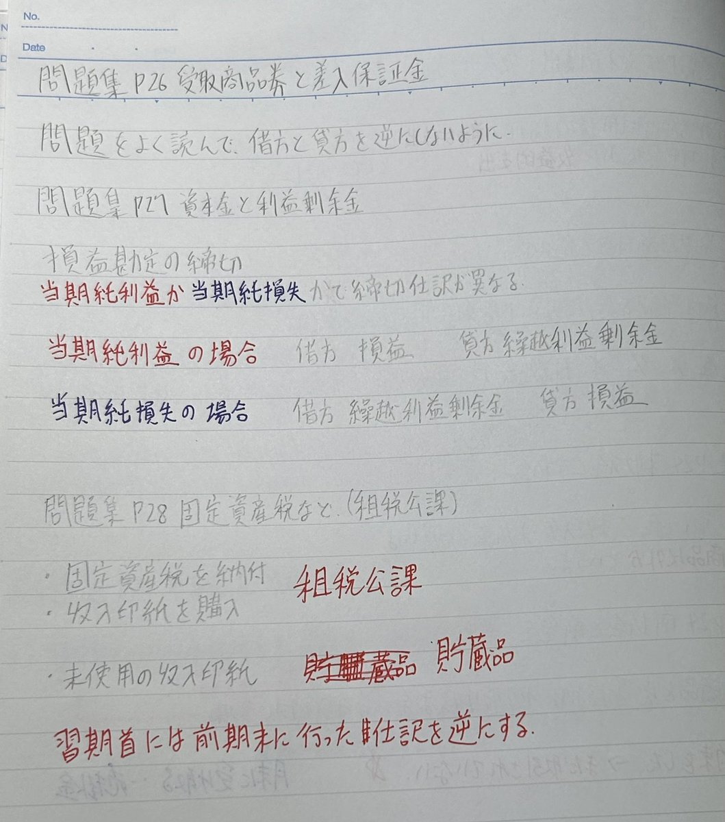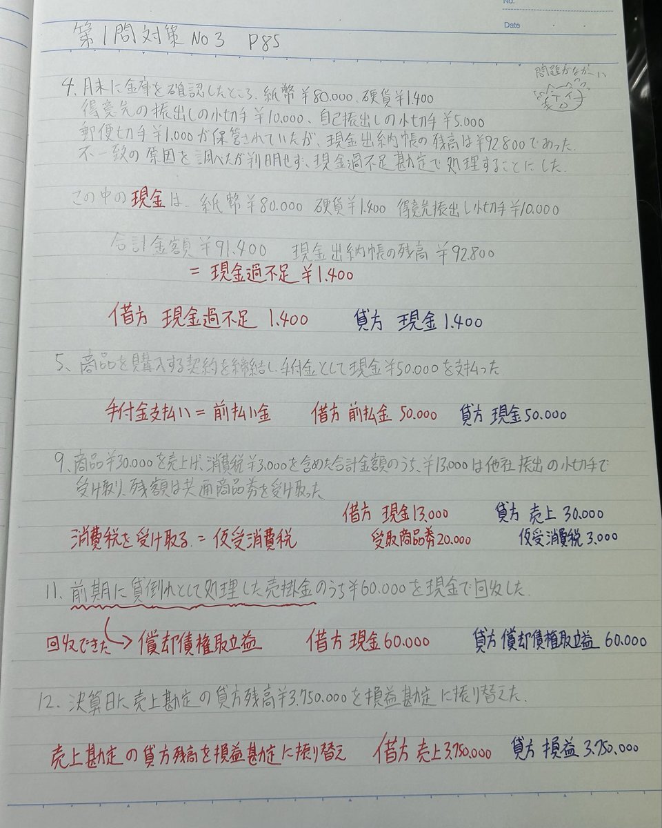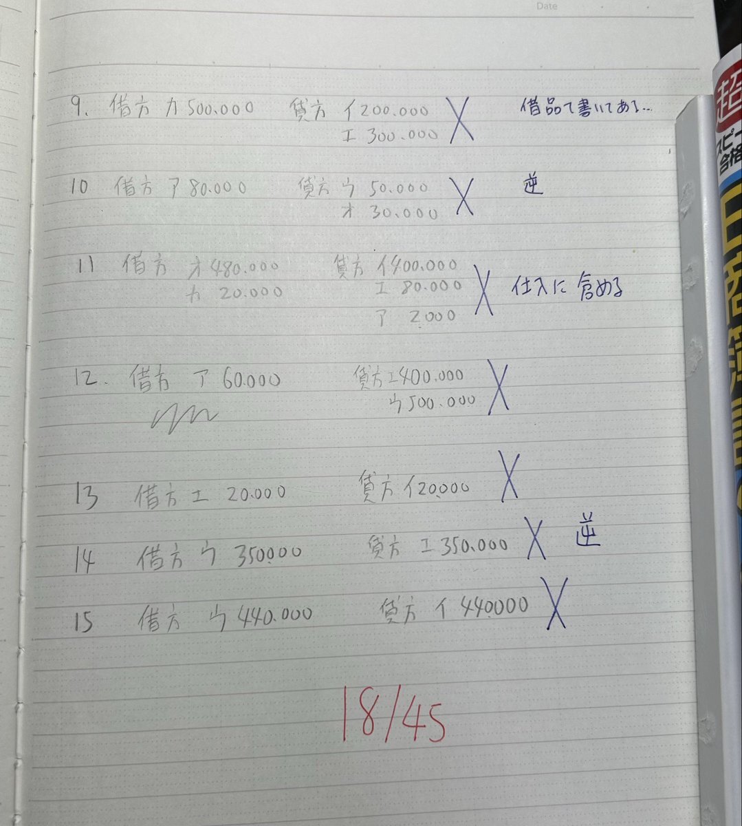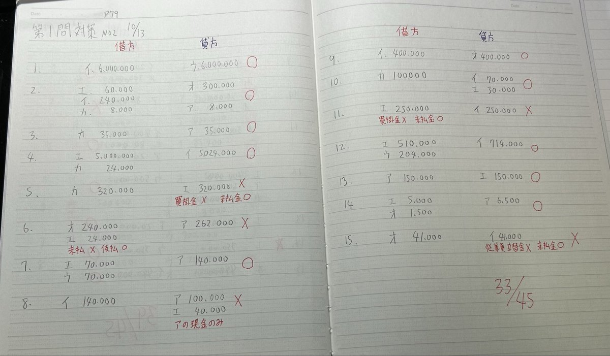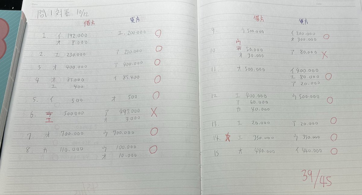昨日は勉強中に少し横になった瞬間に寝落ちした模様…こうやって見直すと添削した跡が多い。 気が付かない間に疲れてたのかもしれないすね。体調管理も含めての試験勉強だー。 #簿記3級 pic.x.com/aMr896L0hR