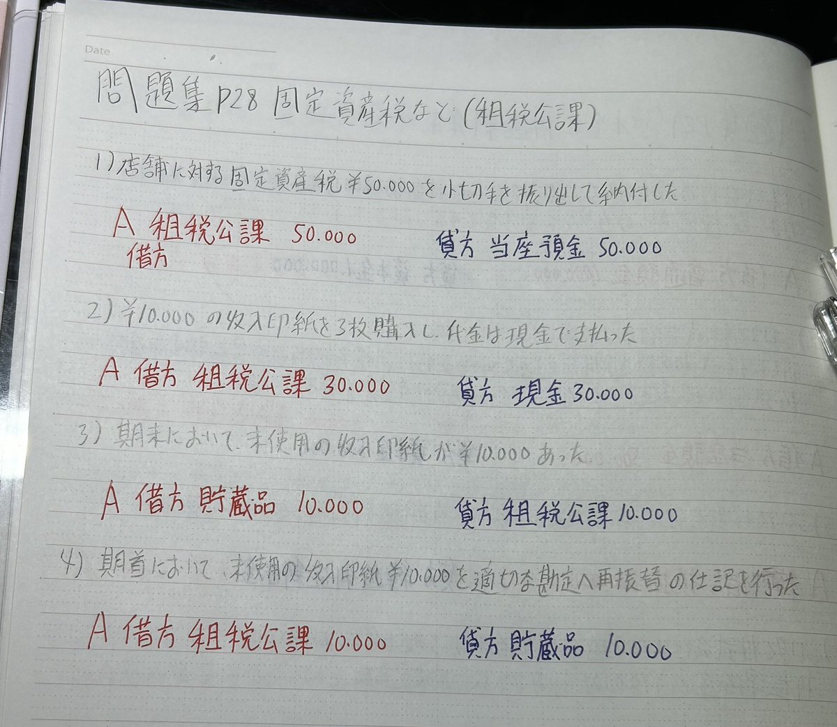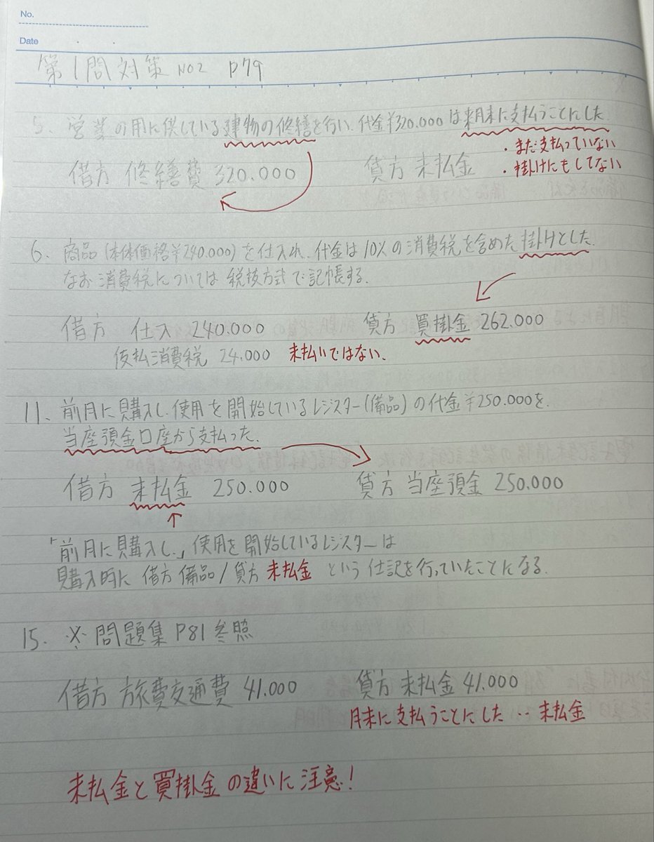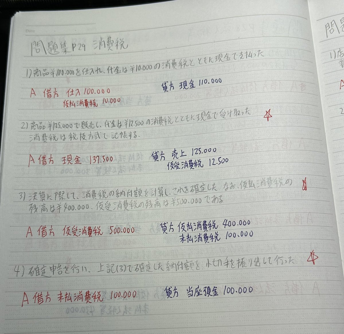 入浴業務後帰宅しての簿記勉強 ついに第一問対策の範囲が終わり、次のページを捲るのが怖いような楽しみのようなw 法人税等と消費税の仕訳は復習必須だわ #簿記3級 pic.x.com/aKQCFJ5p7T