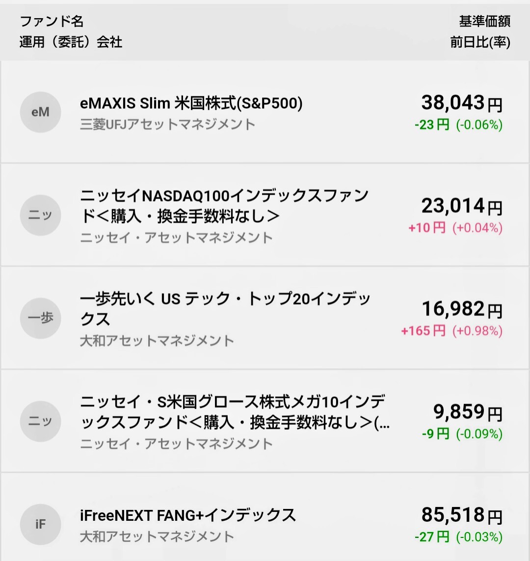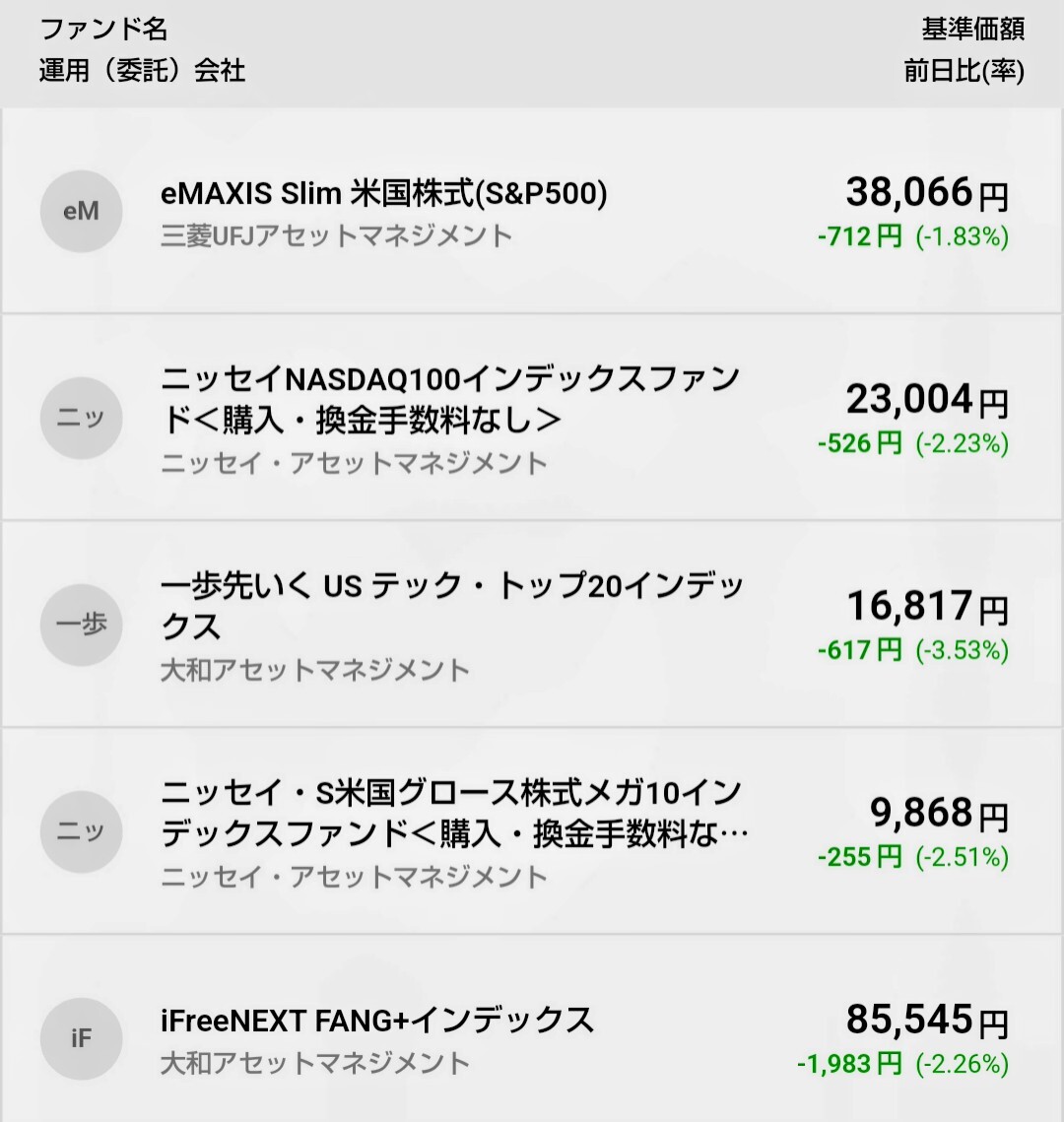 今夜の投資信託(米国株🇺🇸)⤴️⤵️ 一歩が先いくオール下落⤵️コース🥺 ⤵️:eMAXIS Slim 米国株式(S&P500) ⤵️:ニッセイNASDAQ100 ⤵️:一歩先いく US テック・トップ20 ⤵️:ニッセイ・S米国グロース株式メガ10 ⤵️:iFreeNEXT FANG+ #投資信託 #米国株 #FANG $NYFANG #メガ10 #投資家さんと繋がりたい x.com/glglsti2019/st…