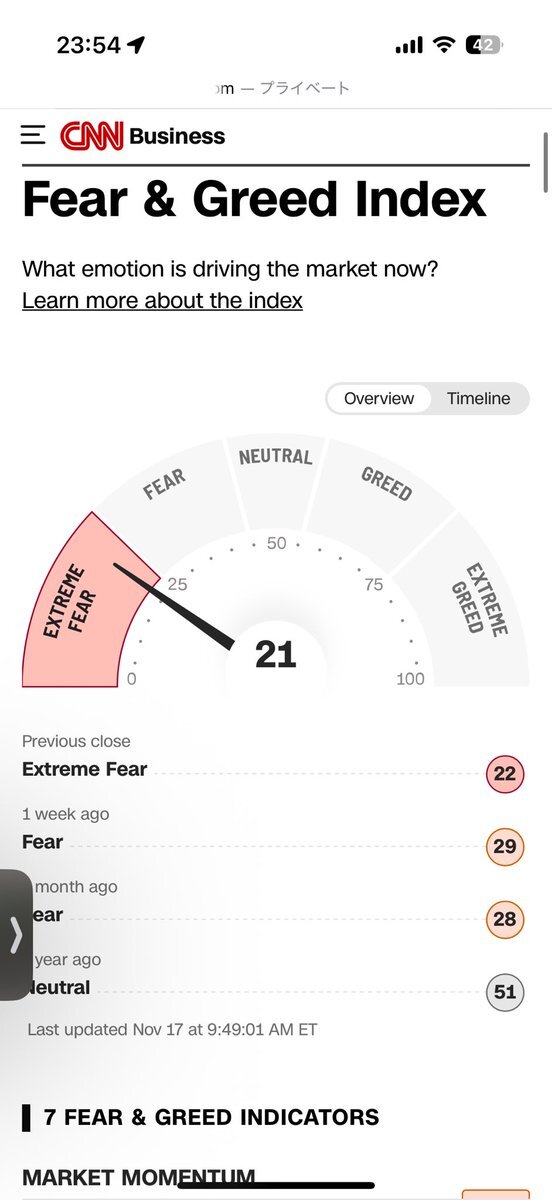 😱恐怖指数 FEAR&GREED ▶︎ 21 EXTREME FEAR #VIX ▶︎ 22.14 🇺🇸金利 02年 #US02Y ▶︎3.564 10年 #US10Y ▶︎4.086 💹SP500 (20日移動平均上率) #S5TW ▶︎ 47.51 トランプ関税ショック😨(4/2から) ZBT(4/25) 政府閉鎖(10/1-11/13) 2025/11/14/23:30 #米国株 #SP500 x.com/saqvanti/statu…