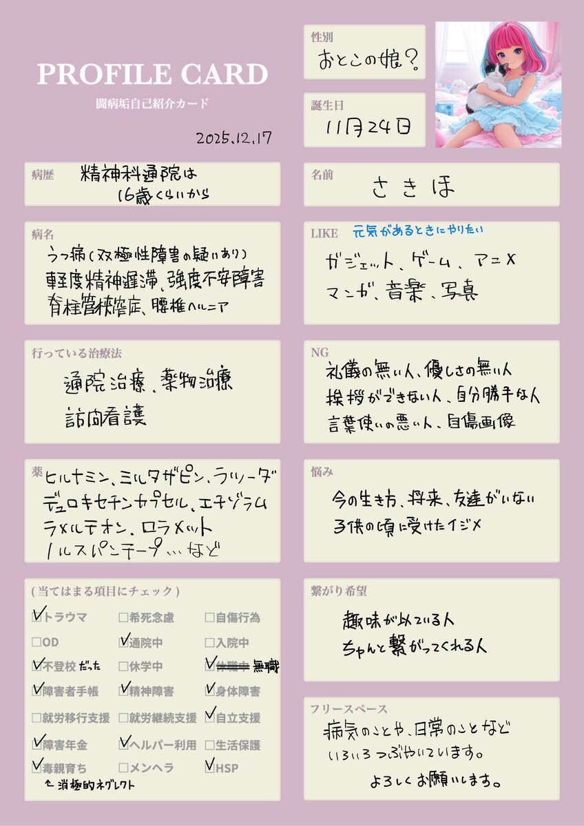 お薬と病名増えたのでタグ更新します 同性の女性のお友達求めてます🥹🫶🏻 リトリン必読𓊆ྀི lit.link/menma19𓊇ྀི #闘病垢さんと繋がりたい #精神疾患を持つ方と繋がりたい #闘病垢自己紹介カード pic.x.com/LHFEIeu5Mq