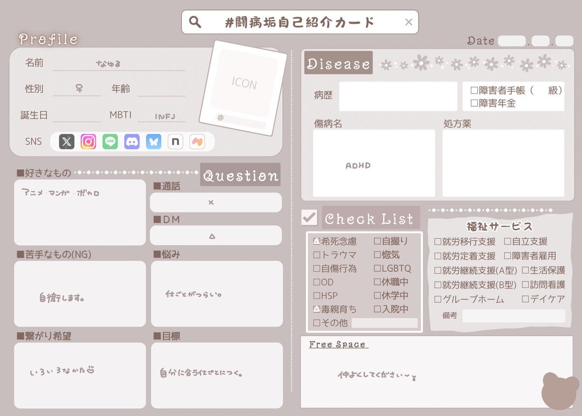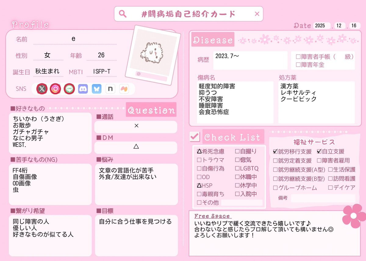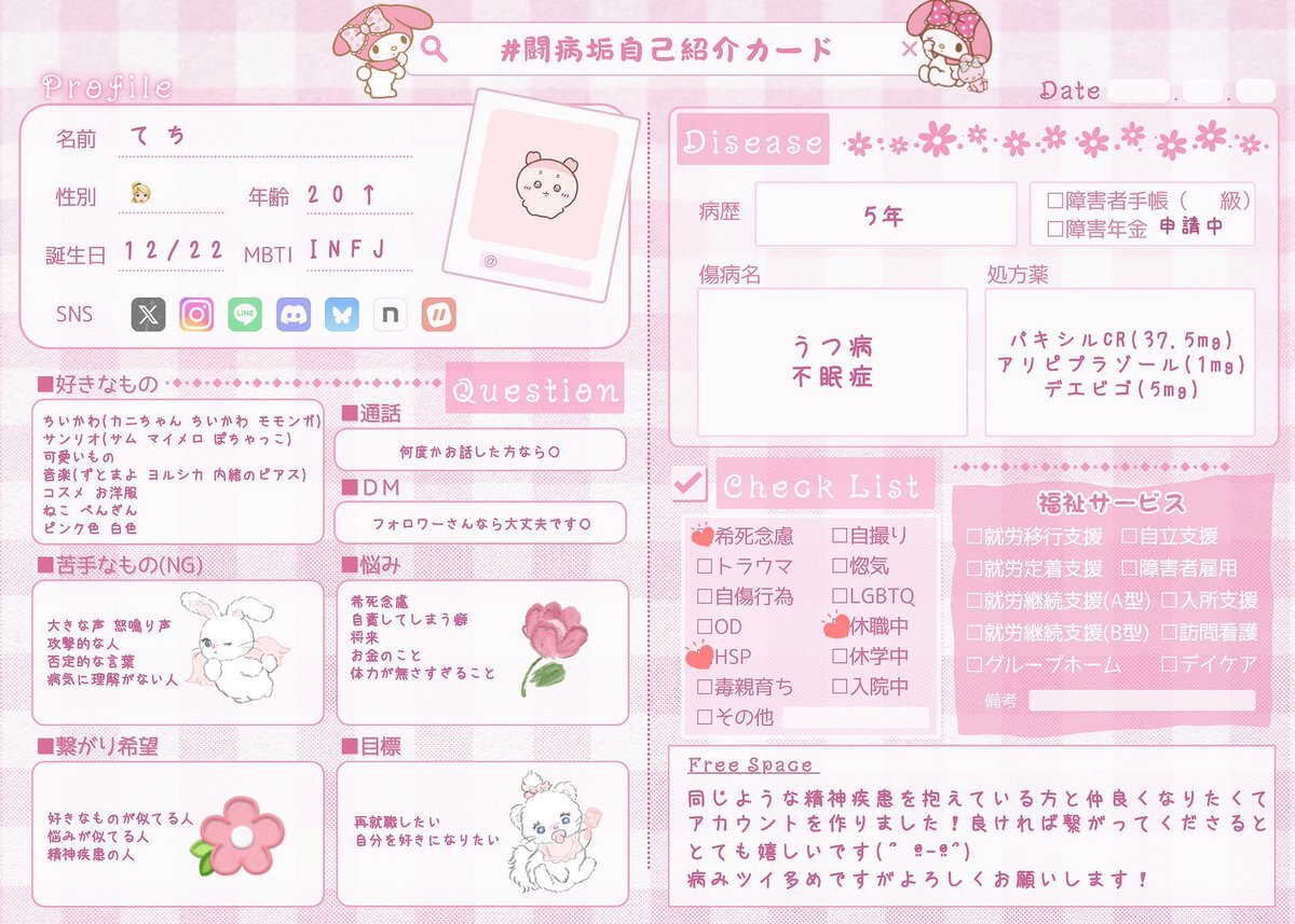 #闘病垢さんと繋がりたい #闘病垢自己紹介カード #精神疾患持ちのための自己紹介カード #精神疾患を持つ方と繋がりたい #双極性感情障害 #心的外傷後ストレス障害 #むずむず脚症候群 #隔離 #身体拘束 #経管栄養 同年代の闘病垢さんとゆるく繋がりたいです! 自発苦手ですがお友達募集中です💖 pic.x.com/p2TxZaErS9