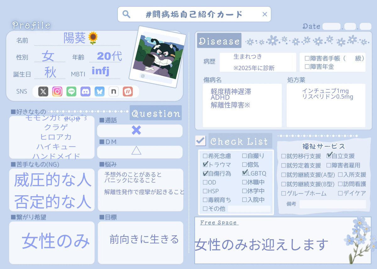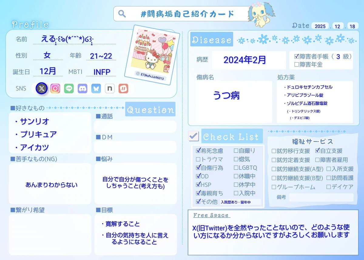 @0 中に反応お願いします🕊𓈒𓏸︎︎︎︎ #闘病垢自己紹介カード #闘病垢さんと繋がりたい #精神疾患を持つ人と繋がりたい #精神疾患を持つ方と繋がりたい #精神疾患持ちのための自己紹介カード x.com/iichan_e/statu…