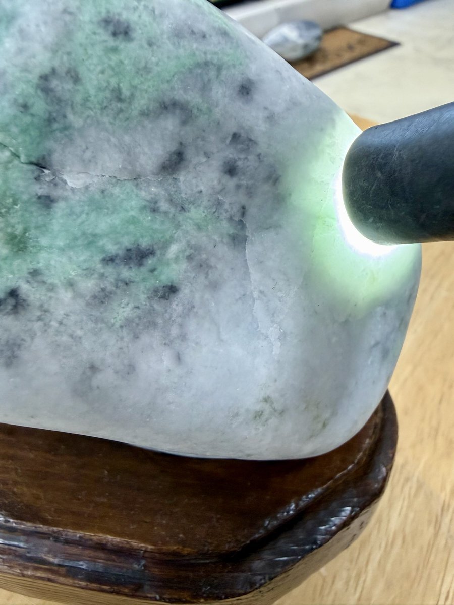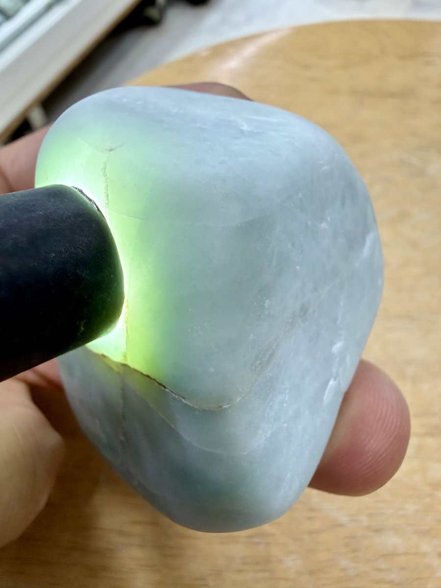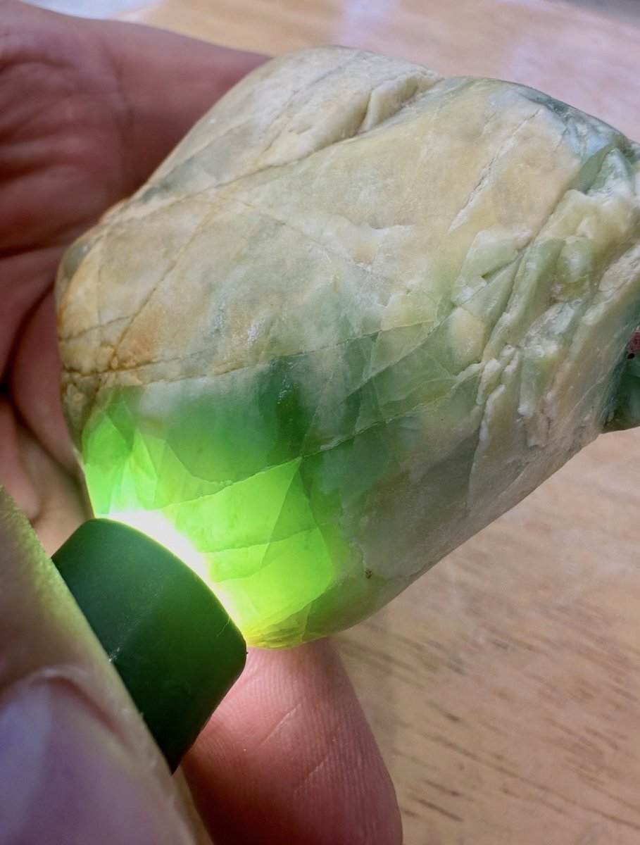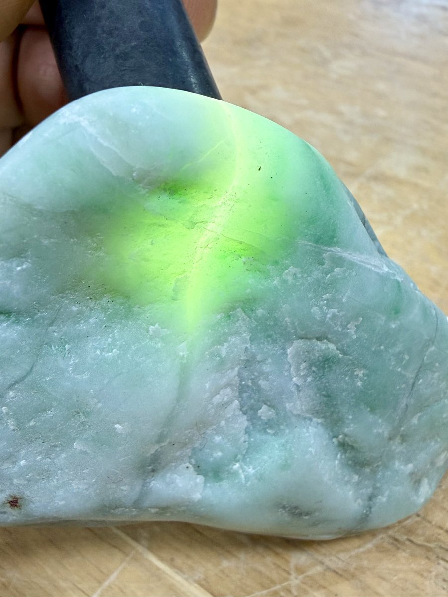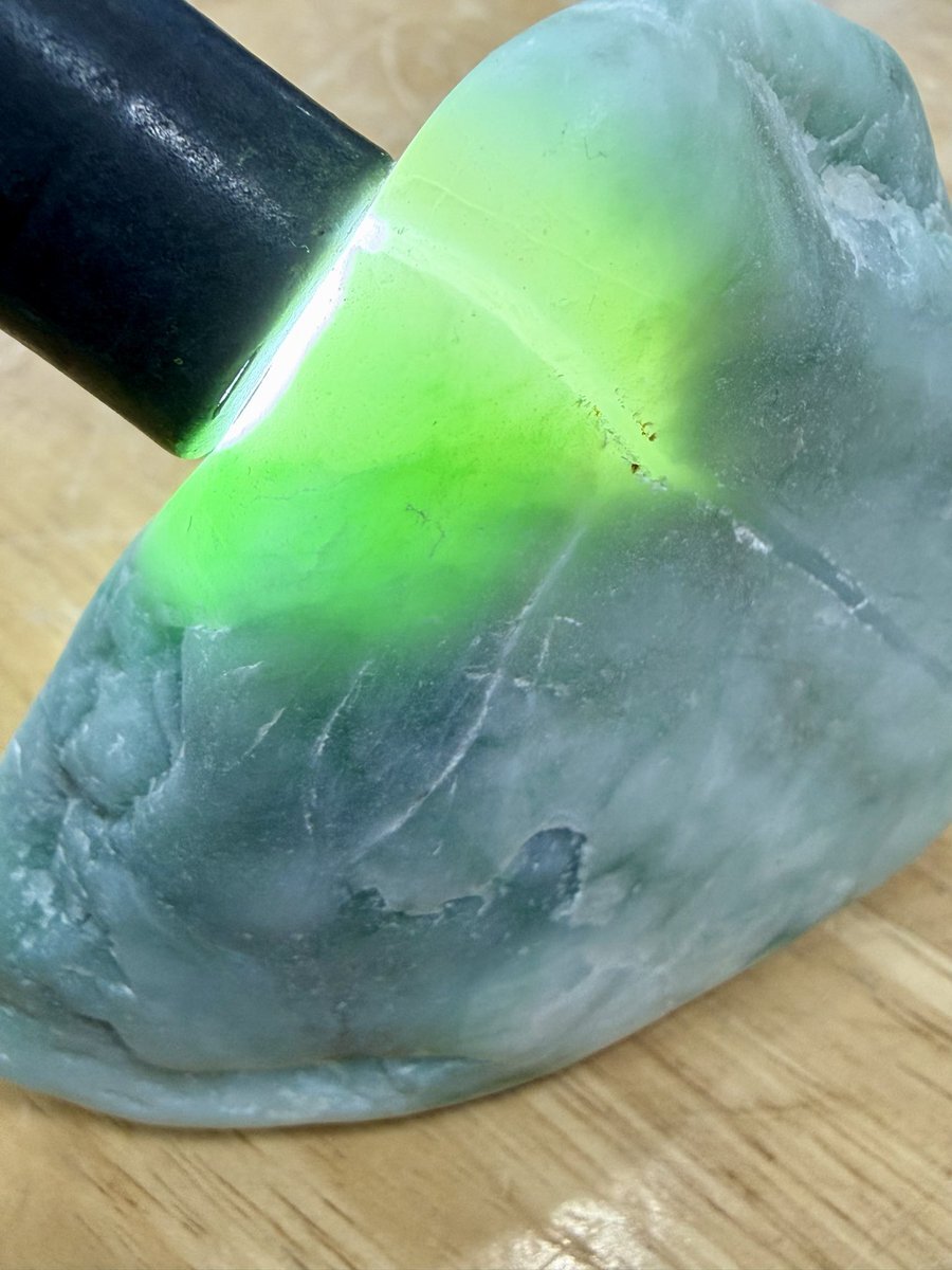 今日のヒスイは、 ロウカン質の一歩手前❗️ 「濃い緑(翠)🟢の翡翠❗️」です😁 最近、濃い緑色の(良質な)翡翠の流通が減っています。 こちらは一見クリソプレーズにも見えなくもないですが、持った時の質感(石の表面だけでなく全体的に)が違いますね😁👍 #濃い緑色の翡翠 #糸魚川翡翠 #ヒスイ原石 pic.x.com/5cOpjFw5nc