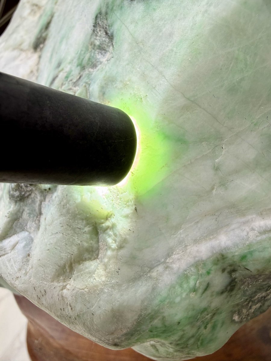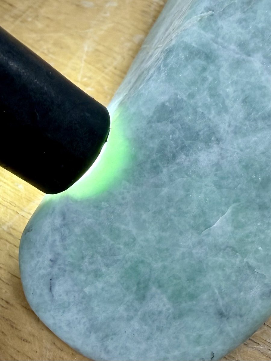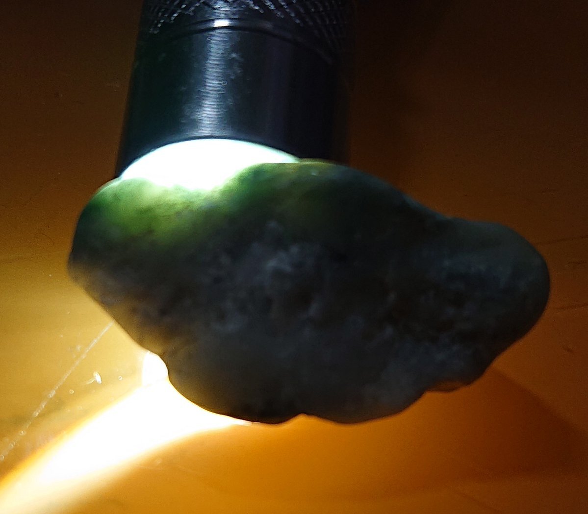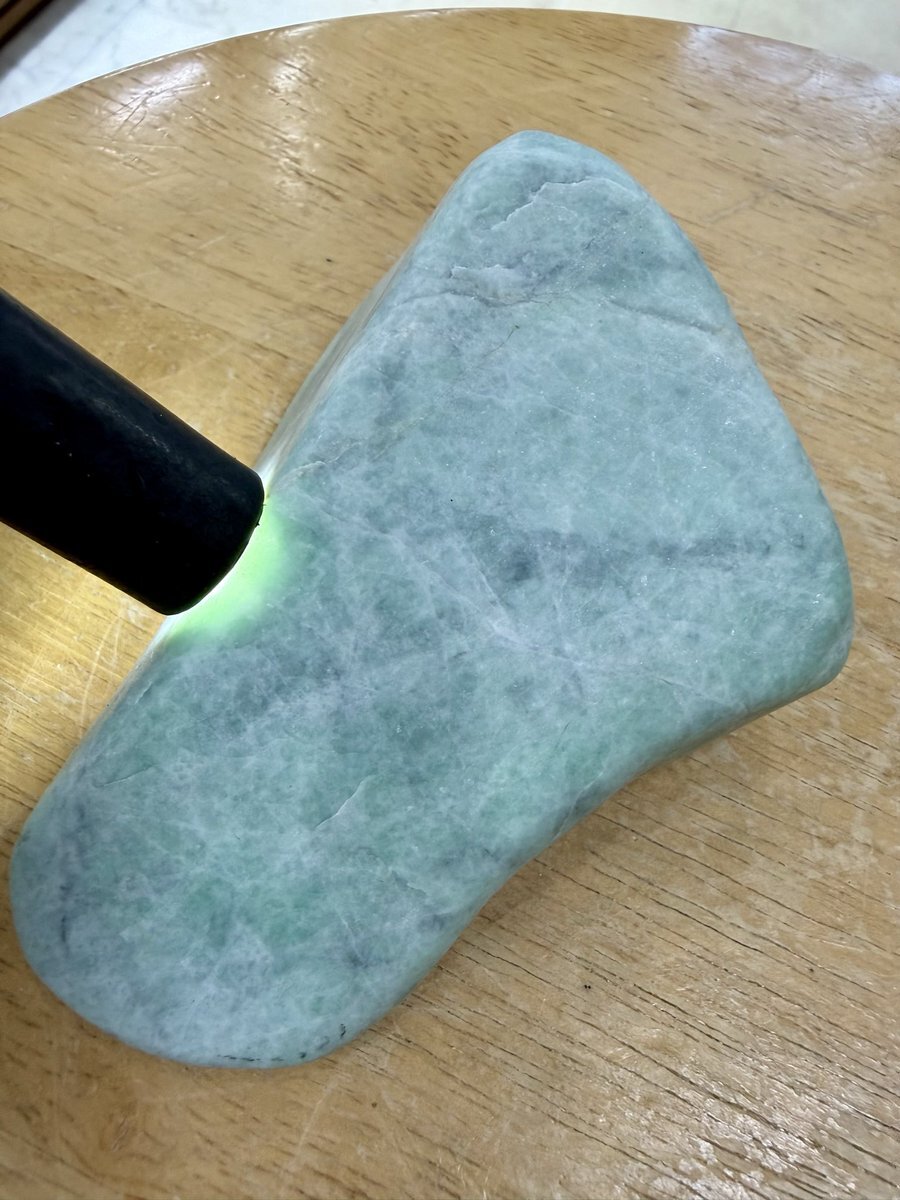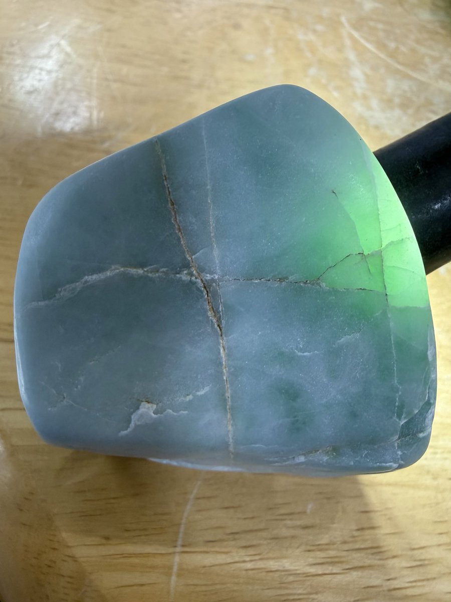 今日のヒスイは、 ロウカン質の一歩手前❗️ 「濃い緑(翠)🟢の翡翠❗️」です😁 最近、濃い緑色の(良質な)翡翠の流通が減っています。 こちらは一見クリソプレーズにも見えなくもないですが、持った時の質感(石の表面だけでなく全体的に)が違いますね😁👍 #濃い緑色の翡翠 #糸魚川翡翠 #ヒスイ原石 pic.x.com/5cOpjFw5nc
