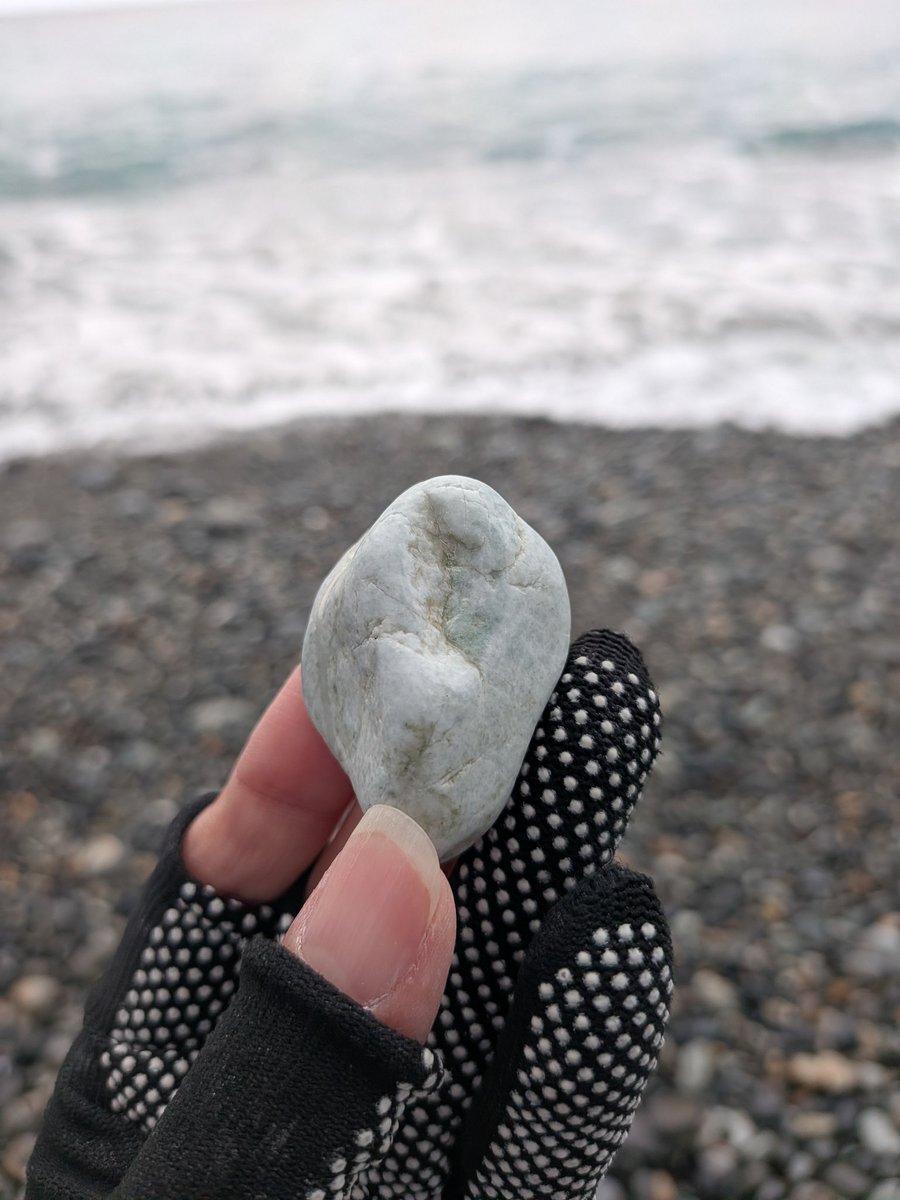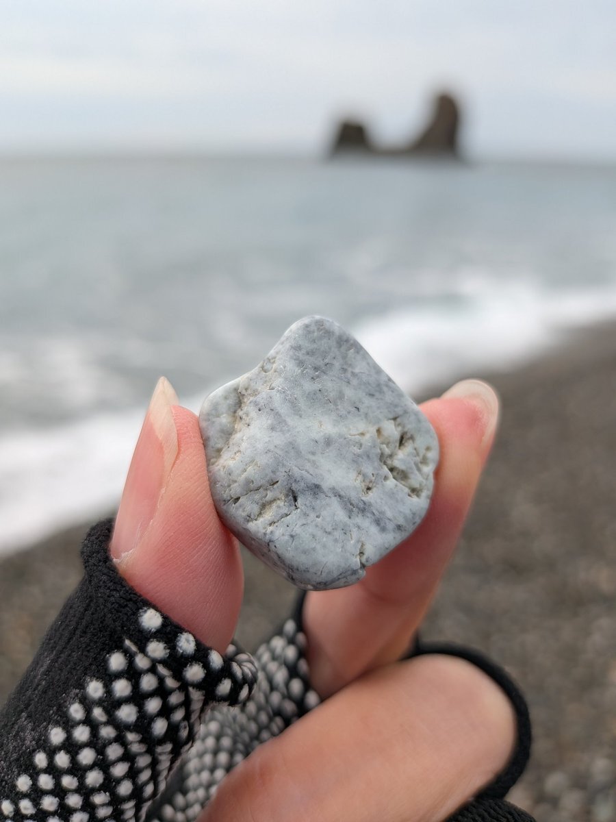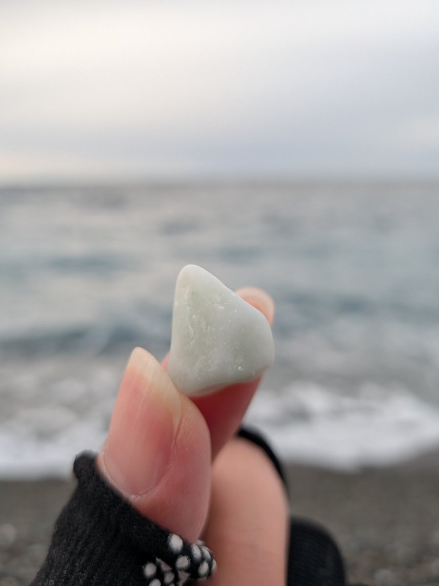 あのあと、別の浜で横川と思われる一石を発見しました☺️ 青が非常に控えめですが三角の特徴的な形✨👍 本日はこの石で打ち止めして帰ってきました 石の打ち上がりが結構少なかったので、まだ砂の中に潜って隠れていると思われます🤔いつ出てきてくれるかな #糸魚川翡翠 pic.x.com/lZadR4D0An