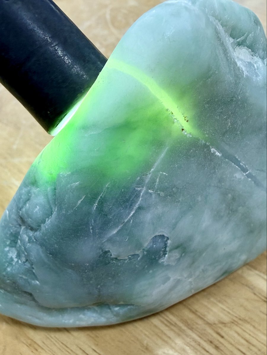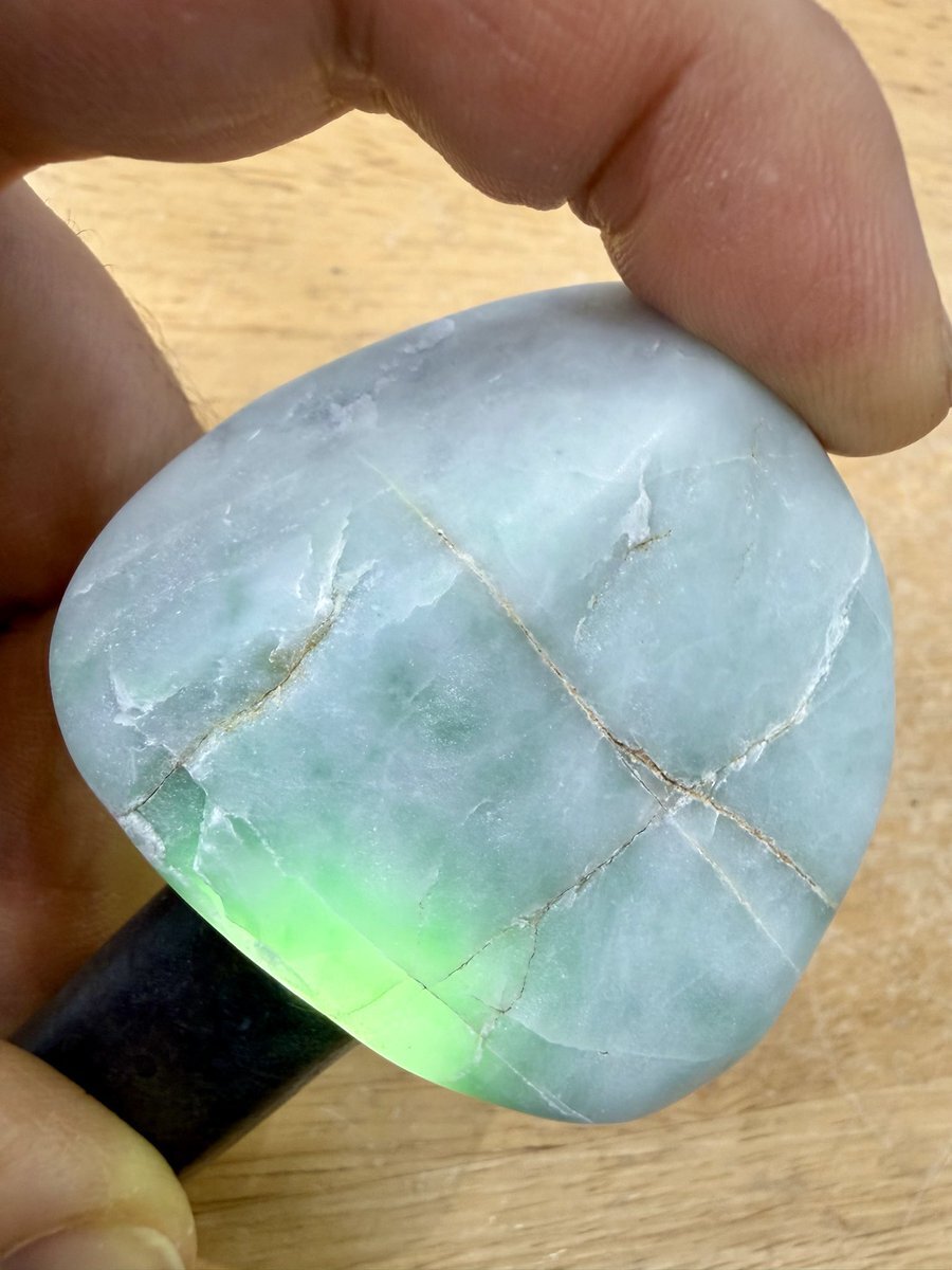 今日のヒスイは、 「姫川水系の優しい色合い🟢ロウカン線❗️」です😁 姫川水系から出る全体的に薄い緑色の翡翠です。真ん中にスゥーッと入る線はガラス質で、これを「ロウカン線❗️」と言い良質な翡翠です。ここにオンファスが絡むと『ロウカン』に一歩近づいて行くのです😁👍 #ロウカン線 #糸魚川翡翠 pic.x.com/0lgQ81STnY