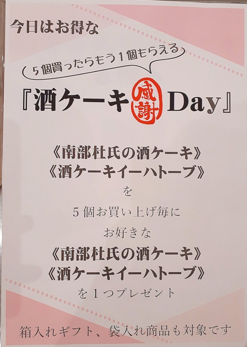 こんにちは!砂田屋フェザン店です!本日お得な『酒ケーキ感謝Day💐』開催中です😄南部杜氏、イーハトーブの酒ケーキ5個購入毎にお好きな酒ケーキ1個プレゼントしております!冷やすと更に美味しくなりますよ🍶´- #酒ケーキ #南部杜氏 #イーハトーブ #純米酒 #本醸造 #焼酎 #吟醸酒 pic.x.com/qKb0Es2pnf