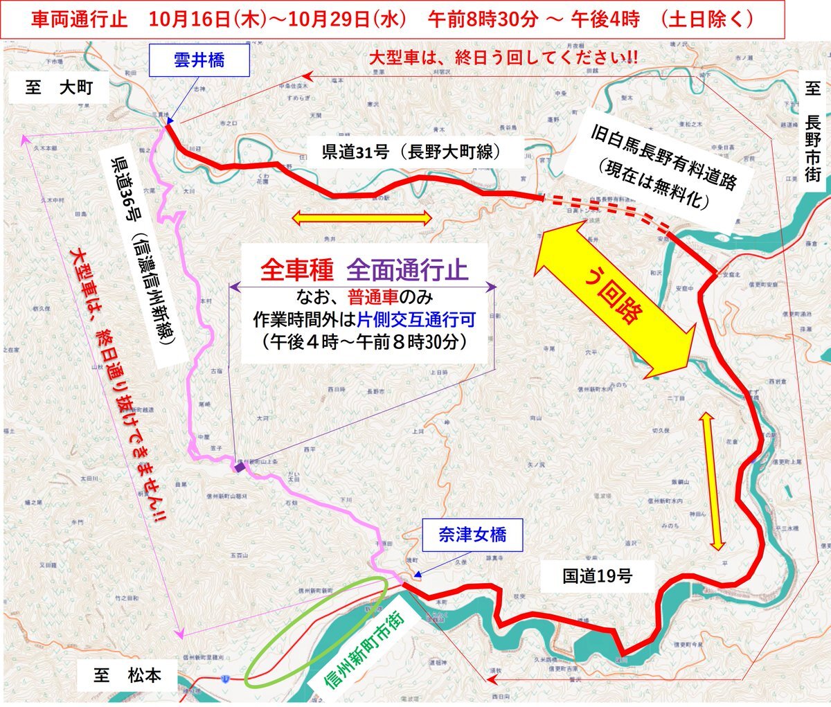 #県道36号 #信濃信州新線 #全車種 #全面通行止 のお知らせ】 #長野市 #信州新町 山上条地籍の道路改築工事のため、10月16日(木)~10月29日(水)(土日除く) 午前8時30分から午後4時の間 #普通車 #全面通行止 となります。 #大型車#終日 #全面通行止 が継続されます。う回にご協力お願いします。 pic.x.com/voYra9kw8U