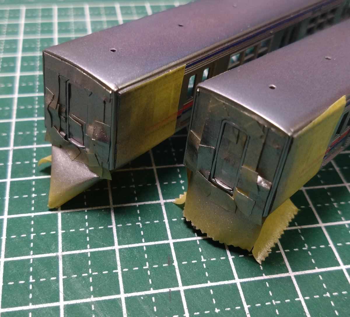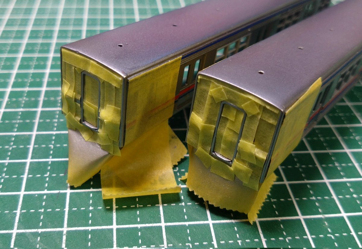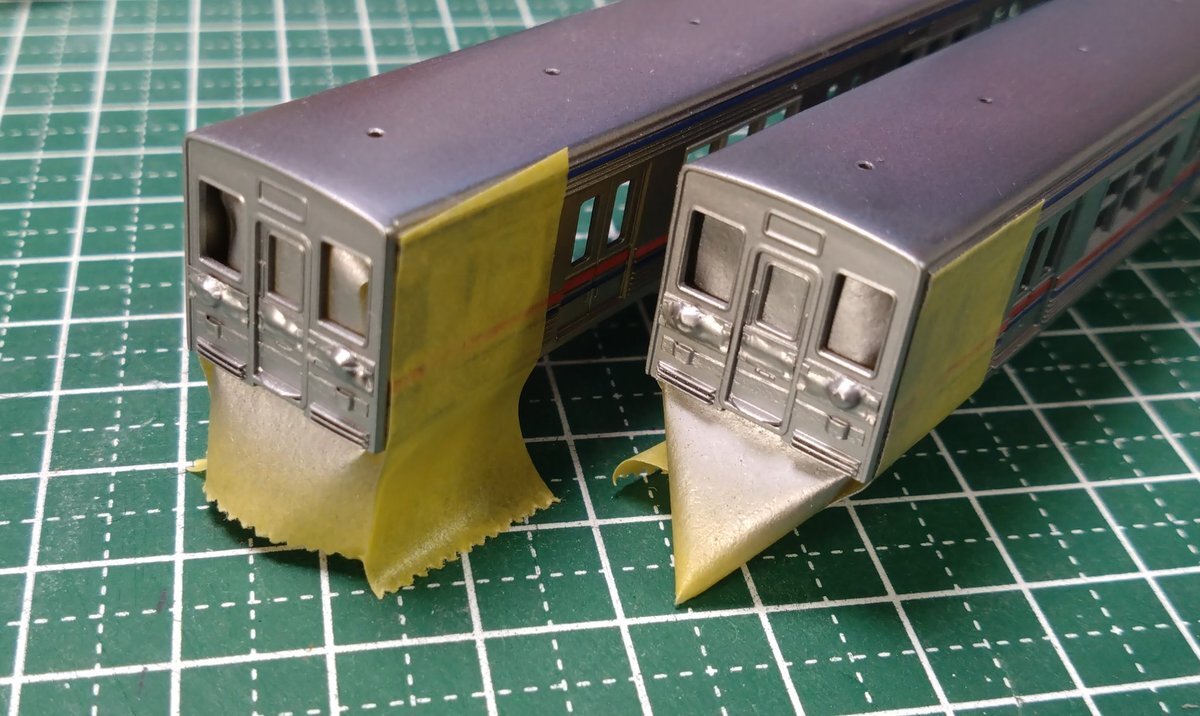 京成3500です!前面の銀を塗り分けてみます。先ずはタミヤのシルバーを使います。側面をマスキングしてから吹き付けます。続いて幌枠や外枠を残すようにマスキングし、こちらはダークステンレスシルバーで塗装します。 #経過 #開運京成キット大会 pic.x.com/idfyiVRMEM