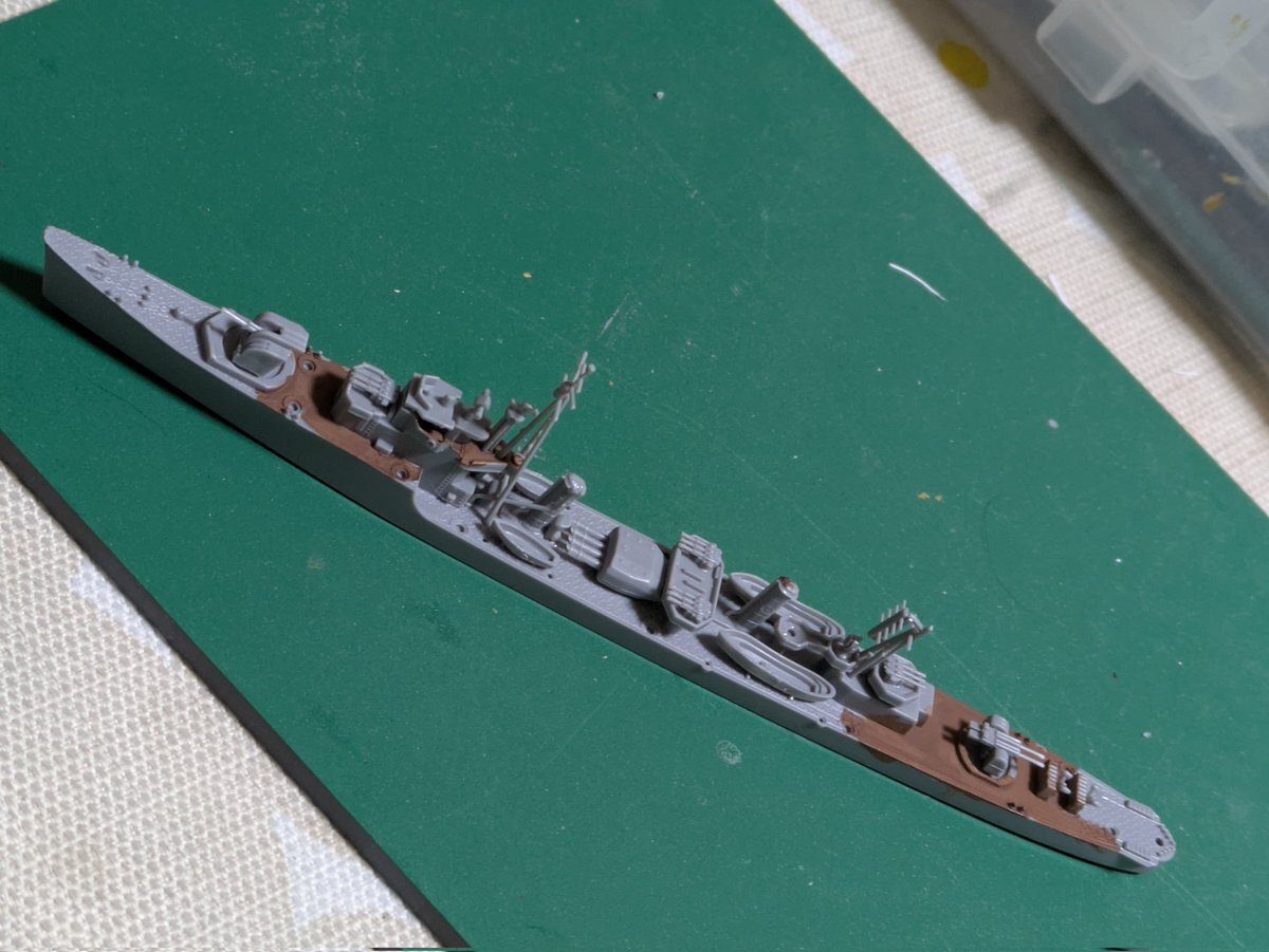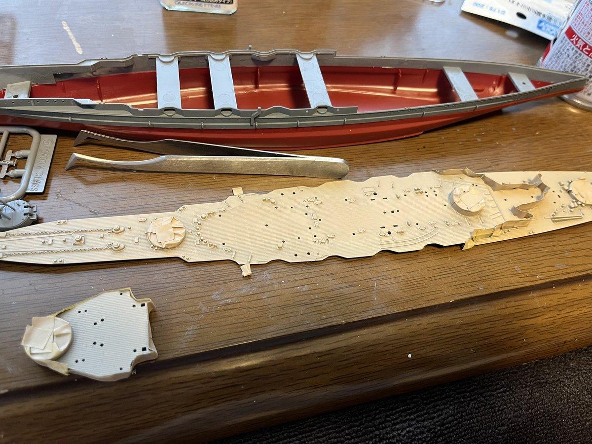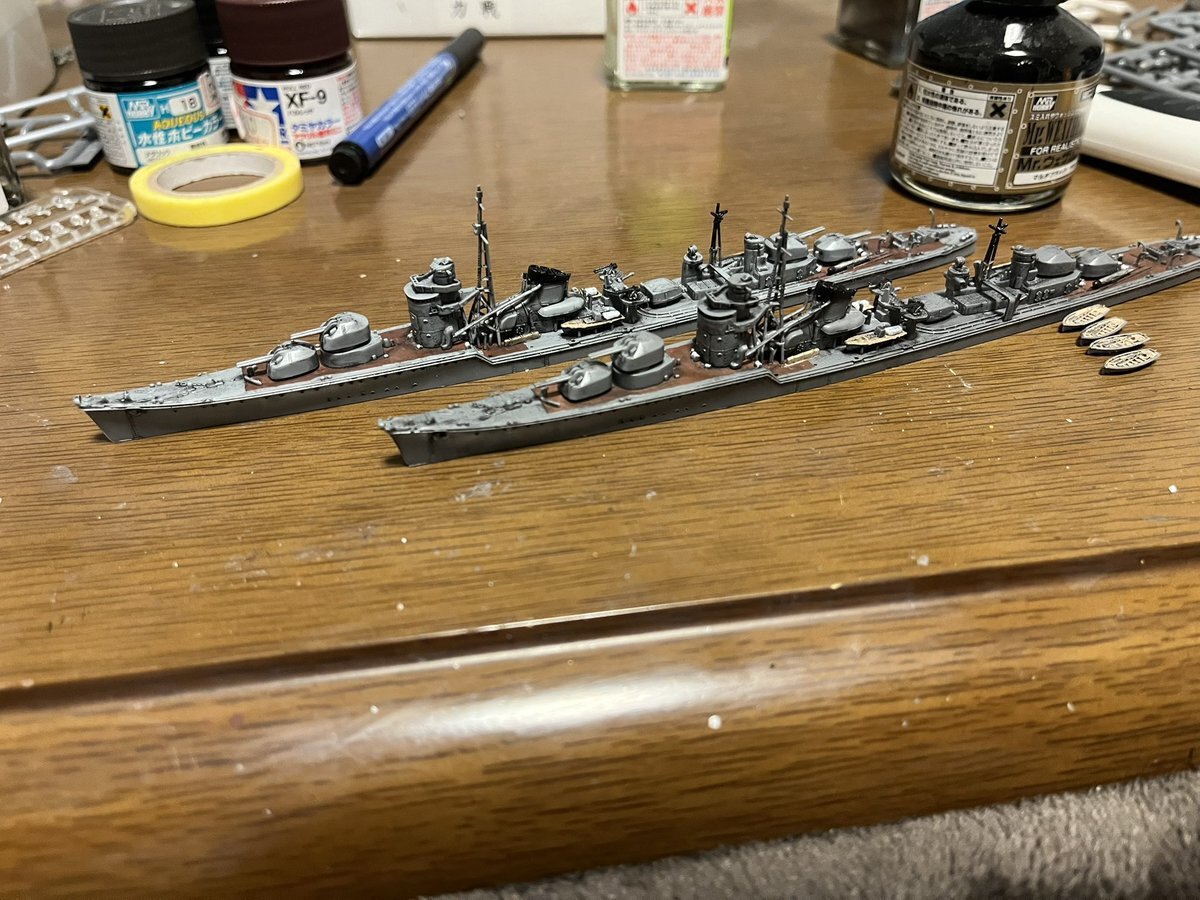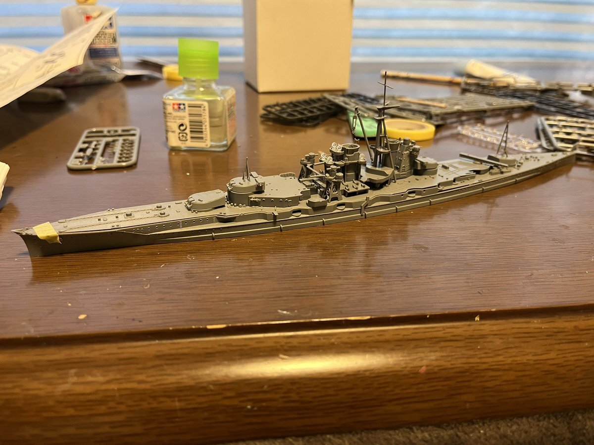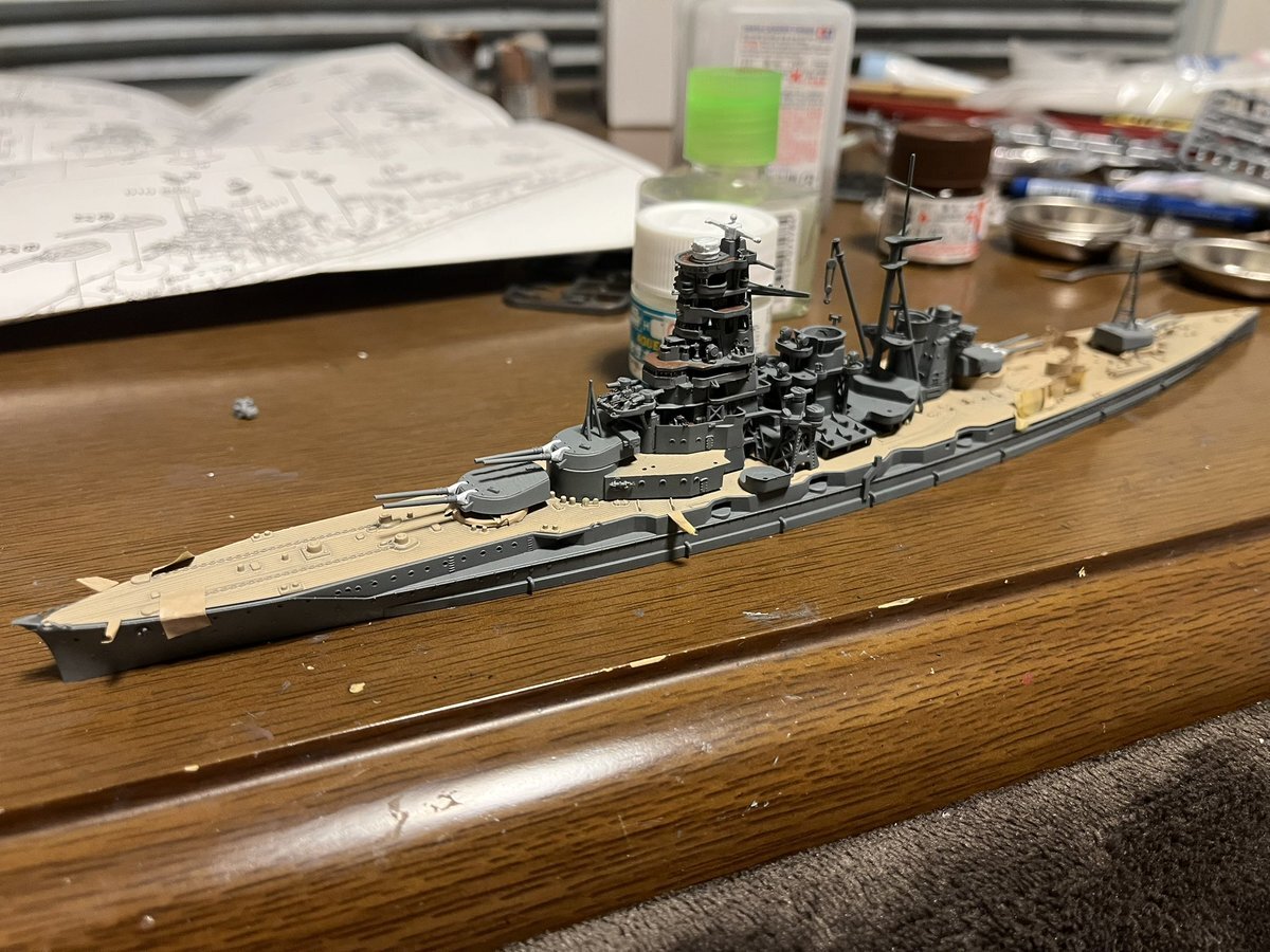 いろいろドタバタしていたせいで今日中には完成できませんでした… まぁあとは船底と艦載艇の取り付けだし明日には完成できるはず #プラモデルライフ #艦船模型 #経過 pic.x.com/ECNNgHzmMb