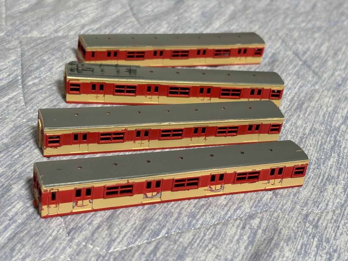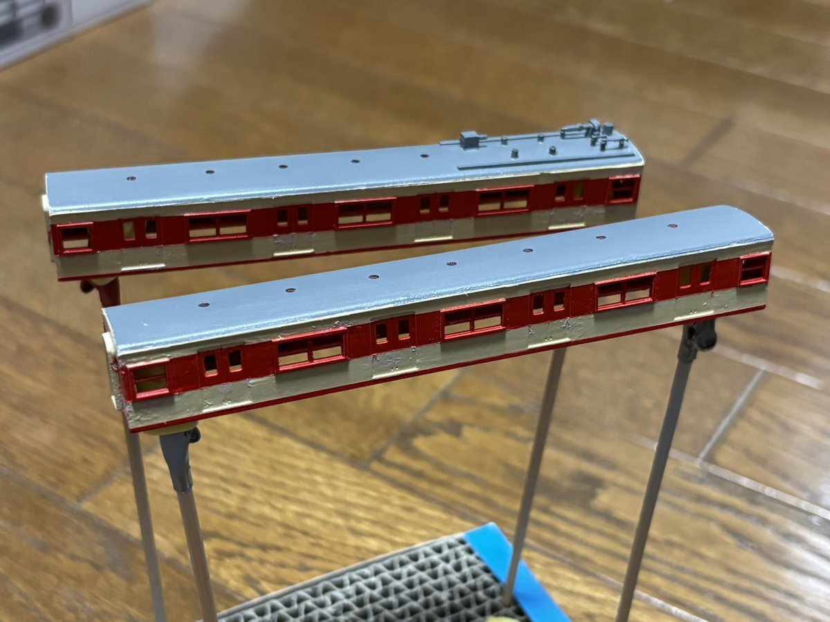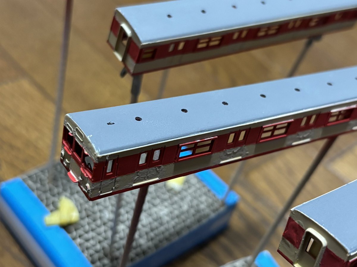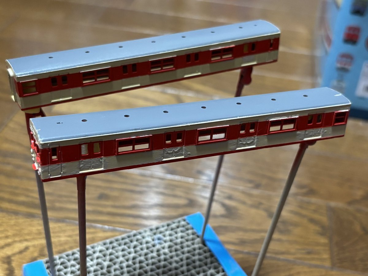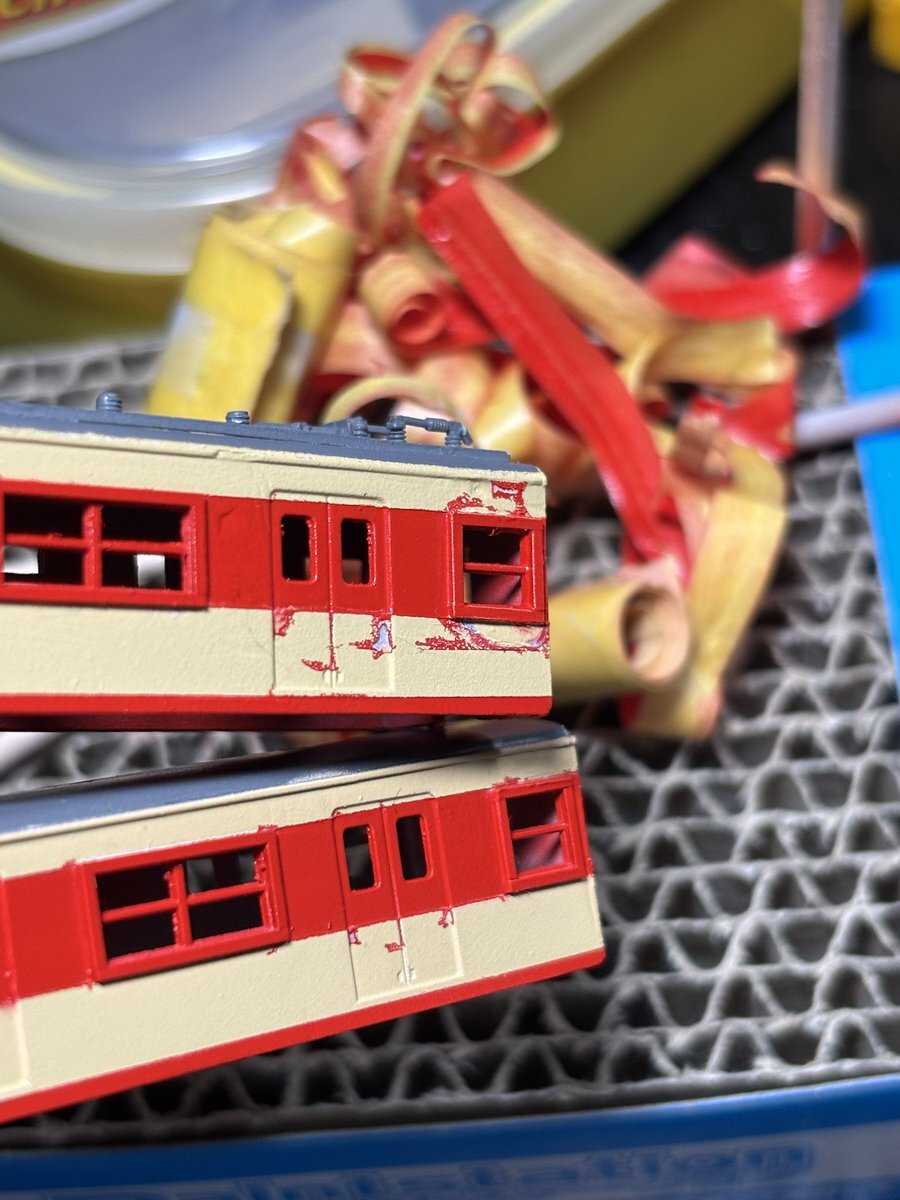 京成3500です!一晩経って塗料が乾いたので、塗装中に入った小ちゃいポッチとかホコリとか削り取ります。それなりに綺麗になりましたら再度スーパーステンレス2を吹き付けます。綺麗になるまで頑張るぞぃ😹。 #経過 #開運京成キット大会 pic.x.com/MEiI1FOs1c