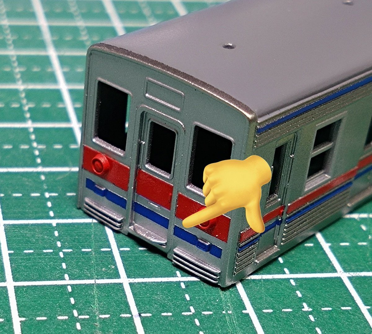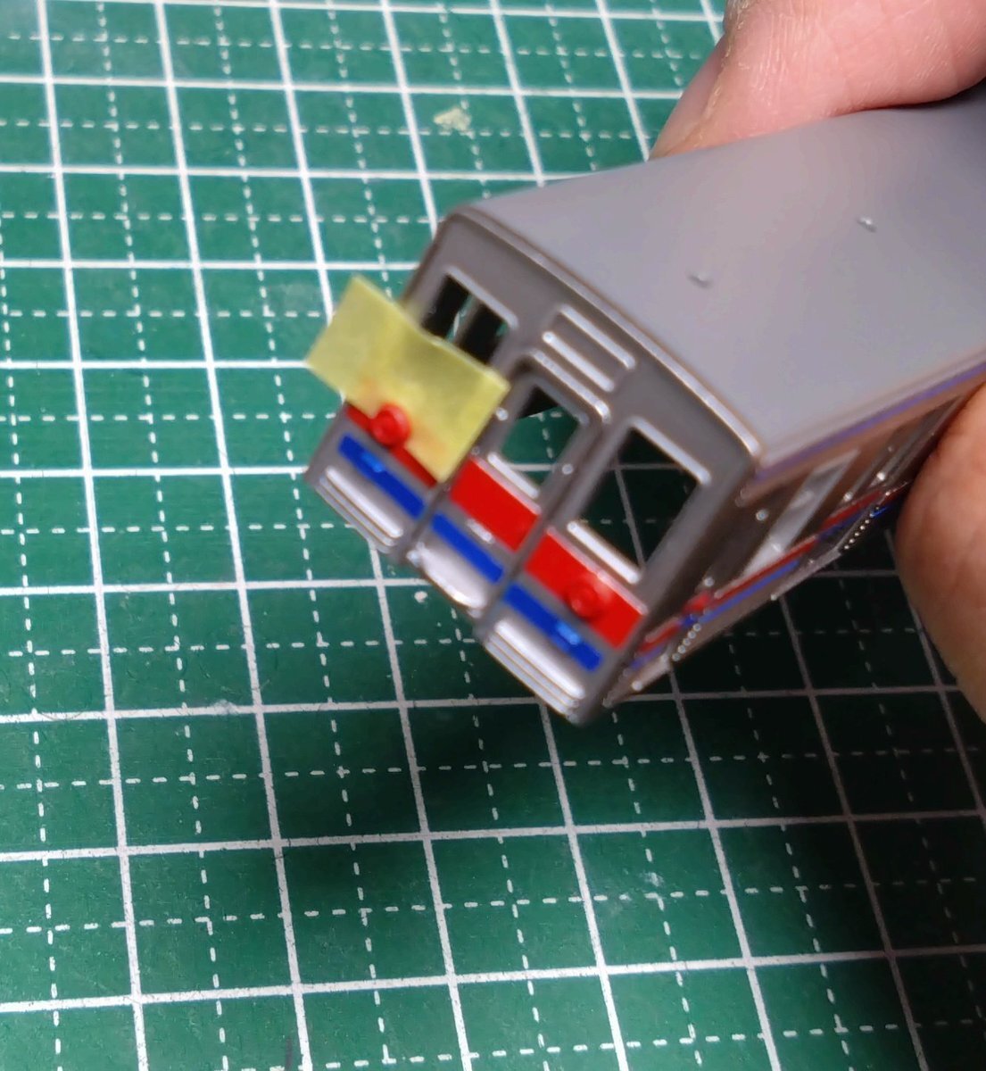 京成3500です!今回はリアル。先ずはライト下を真っ直ぐ貼れるぐらいに細切りしたマスキングテープを写真のように貼ります。アイズの0.4mmならそのままいけます。 #経過 #開運京成キット大会 pic.x.com/MFMeS7oYqw