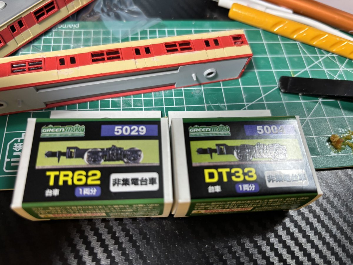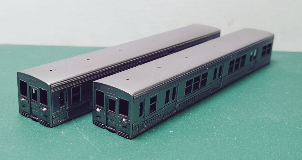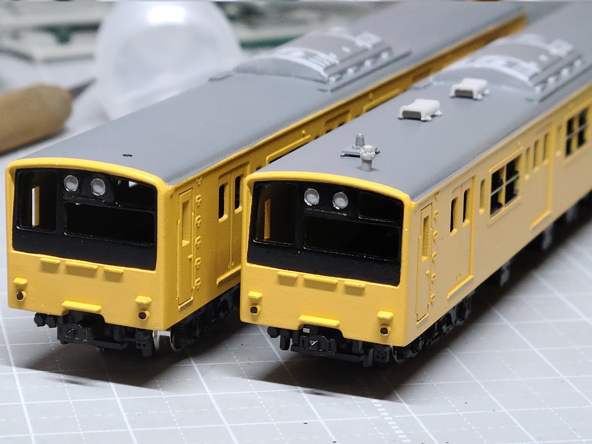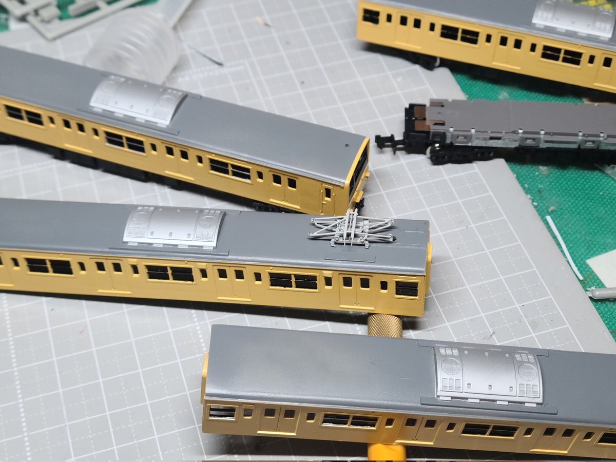 #GM201系板キット大会 #経過 ラストスパート! 部品を組み付けます。 窓はキット付属の透明板を接着。 屋根上機器も本接着します。 台車はものが無いので、似ている台車を使います。 M車にDT33、T車にTR62を使用しました。 床下機器は103系のものを使います。 pic.x.com/TQXd2utJ4X