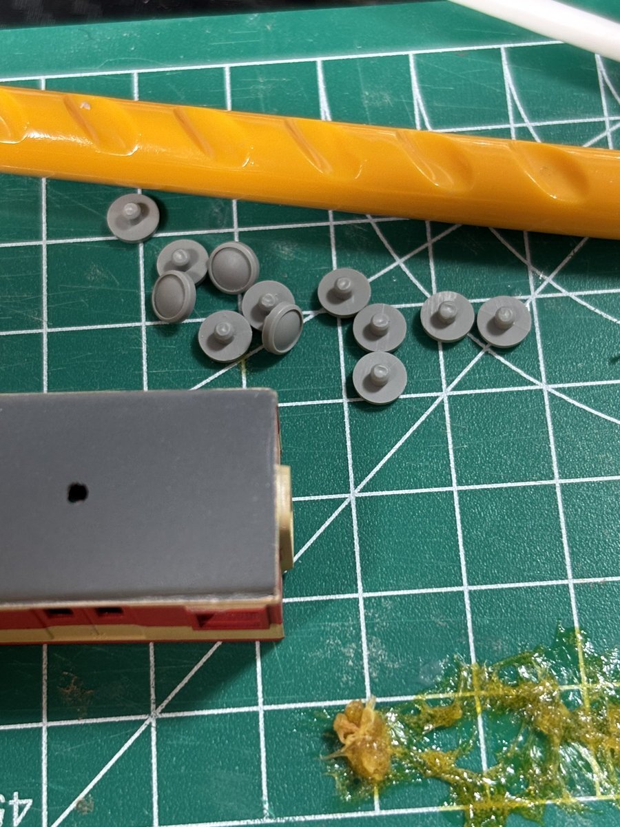 京成3500です!今日は小パーツの仕上げと塗装を行いました。クーラーは中心付近にヒケや傷があるので瞬間接着パテで埋めてからヤスリがけをして仕上げました。意味があるのか不明です(笑)!台車は京成っぽく緑色に仕上げました😹。 #経過 #開運京成キット大会 pic.x.com/ih9BSAFexC