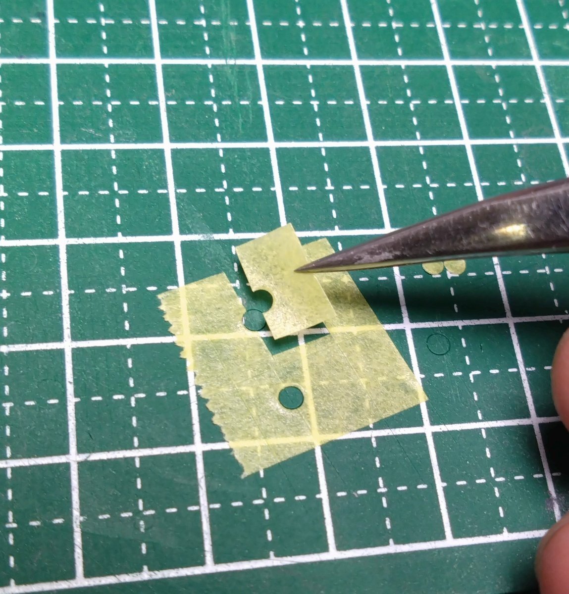 京成3500です!ヘッドライトをマスキングします。先日の帯マスキングでヘッドライトのモールドは約2mmだったので、同径のポンチでマスキングテープを抜きます。写真のように半分に切ってからライト周りをマスキングします。 #経過 #開運京成キット大会 pic.x.com/b9l5es84pk