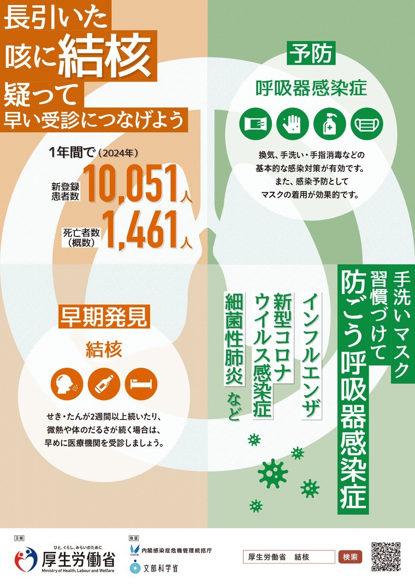 \長引く体調不良は #結核 かも?/ 今年も県内で結核の集団感染が発生😰 #結核 は過去の病気ではなく、今も国内で年間約1万人が発症している重大な感染症です。 2週間以上せき、痰、発熱が続く時は医療機関の受診を! また、早期発見のため定期健診などで胸部レントゲン検査を年1回受けましょう。 pic.x.com/FcPSH1QT3L