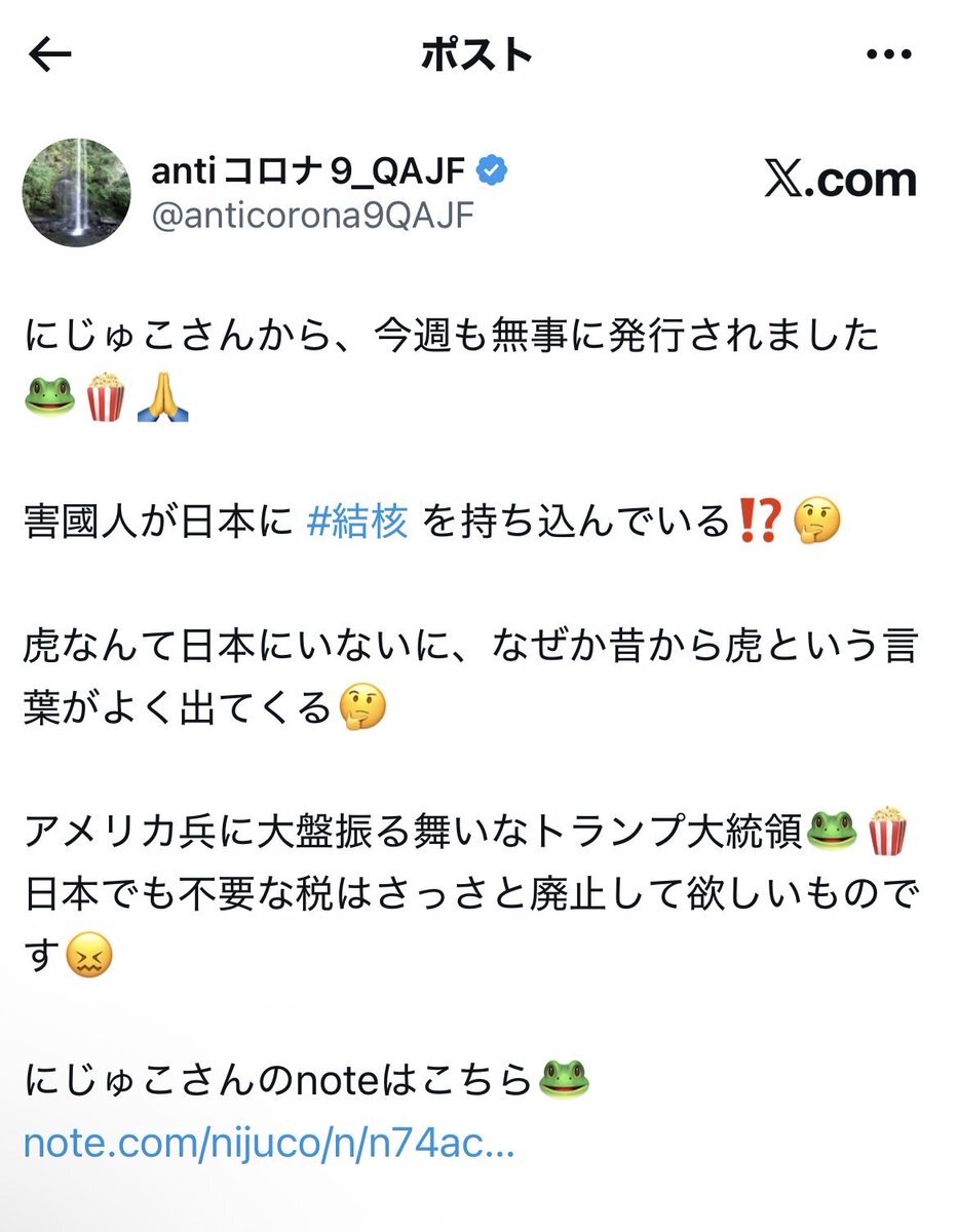 にじゅこさんから発行されました🐸🍿 害國人が日本に #結核 を持ち込んでいる⁉️🤔 虎なんて日本にいないに、なぜか昔から虎という言葉がよく出てくる🤔 アメリカ兵に大盤振る舞いなトランプ大統領🍿 日本でも不要な税はさっさと廃止して欲しいです😖 にじゅこさんのnote🐸 note.com/nijuco/n/n74ac… pic.x.com/VuYxlvqie7 x.com/anticorona9qaj…