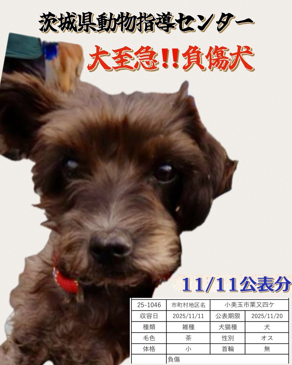 🆘大至急‼️負傷犬🆘 詳細不明の負傷で保護されてます 飼い主さんお迎えお願いします 大至急お迎えに繋がりますように 心当たりのある方は知らせてください🙇🏼‍♀️🙏🏻 🆘11/11茨城県動物指導センター 🚨公表期限11月20日 🔹小美玉市栗又四ケで保護 🔹雑種.オス.茶.小型 🔹 首輪無し pref.ibaraki.jp/hokenfukushi/d… x.com/omitama_kankyo…