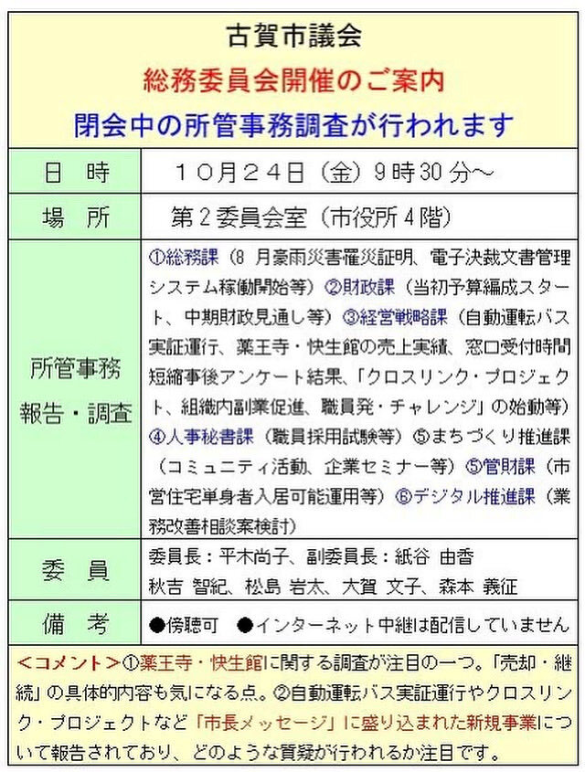 10月24日の9時30分から総務委員会が開催され、閉会中の所管事務調査が行われます。薬王寺・快生館などについて質疑が行われます。閉会中の所管事務調査は市民の皆さんになじみが薄いかもしれませんが大事な調査です。ご都合の良い方はぜひ傍聴してください。 #古賀市 #ぬま健司 #総務委員会 pic.x.com/xcnsHTfru5