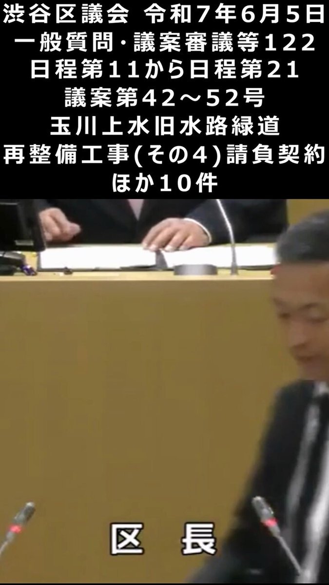 渋谷区議会 令和7年6月5日 122 日程第11から日程第21 議案第42~52号 玉川上水旧水路緑道再整備工事(その4)請負契約 ほか10件 #shorts youtube.com/shorts/Y5MkY8O… 日程第20 議案第51号 玉川上水旧水路緑道再整備工事(その4)請負契約 #渋谷区議会 #加勢造園株式会社 #玉川上水旧水路緑道 #総務委員会 x.com/Shibuya_no_Sor…