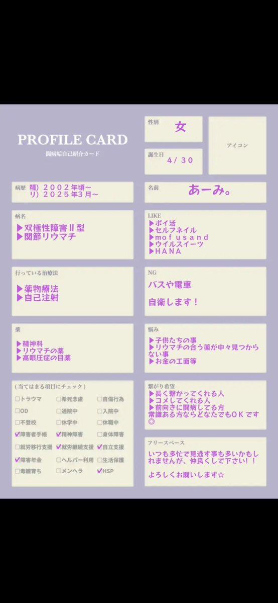 暫く更新してなかったから プロフィール更新🙂↕️ #闘病垢 #双極性障害 #関節リウマチ #線維筋痛症 #闘病垢さんと繋がりたい #シンママ #A型就労 前向きに闘病されてる方是非仲良くしてください🙌 よろしくお願いします✩.*˚ pic.x.com/b8rGVGdqWi