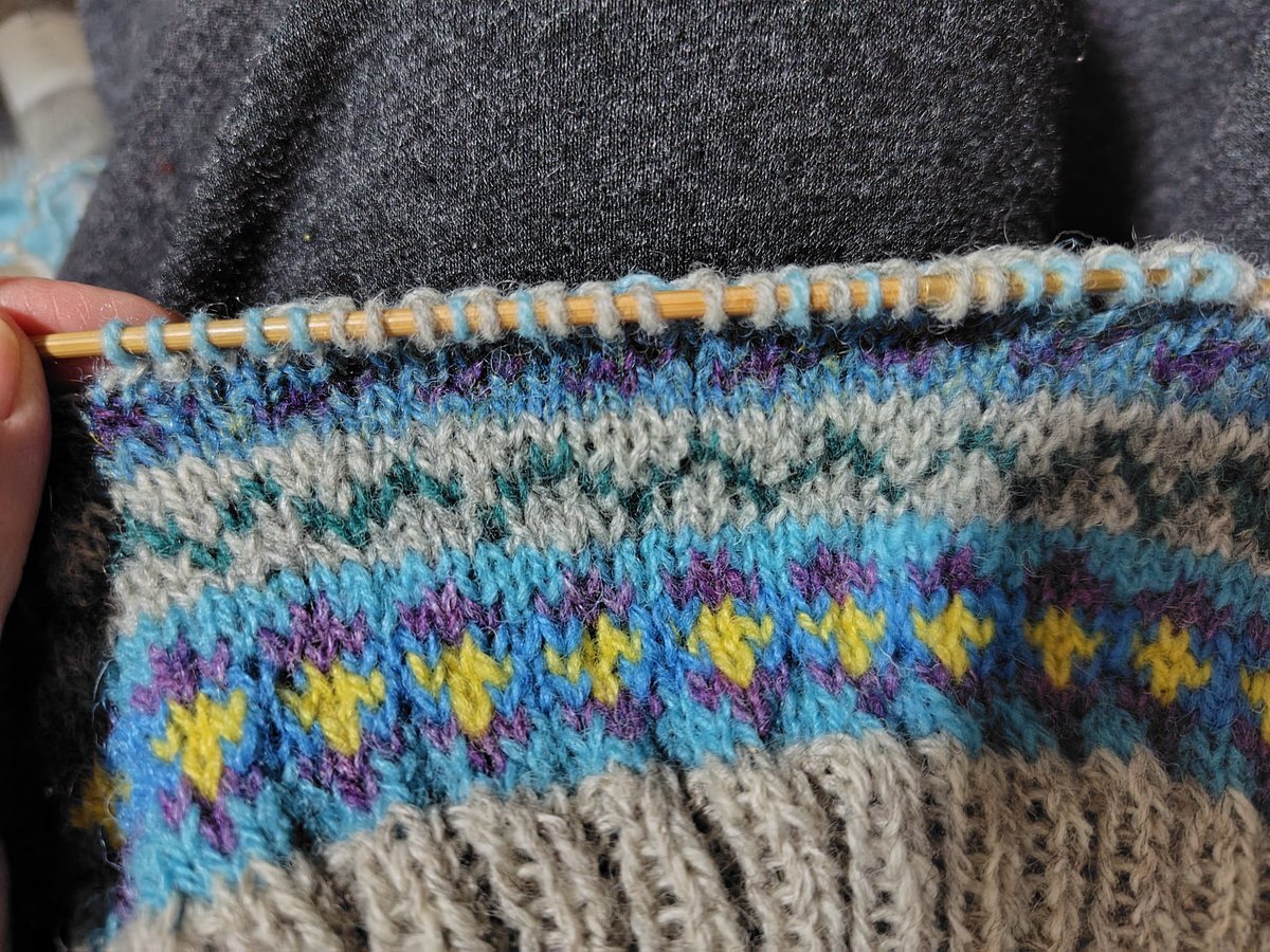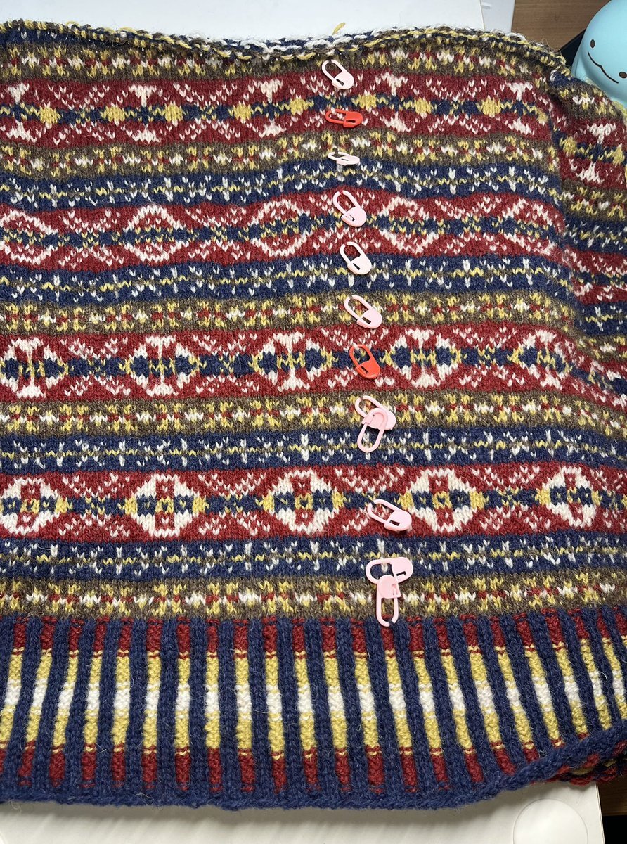 引っ越しでお休みしていたフェアアイルのカーディガンを再開 年末年始の旅行には間に合いそうにありませんが、襟ぐり位置まで編めました🙂✨ #フェアアイル #シェットランドウール #編み物 #棒針編み #編み込み pic.x.com/MlgjYfhS8r
