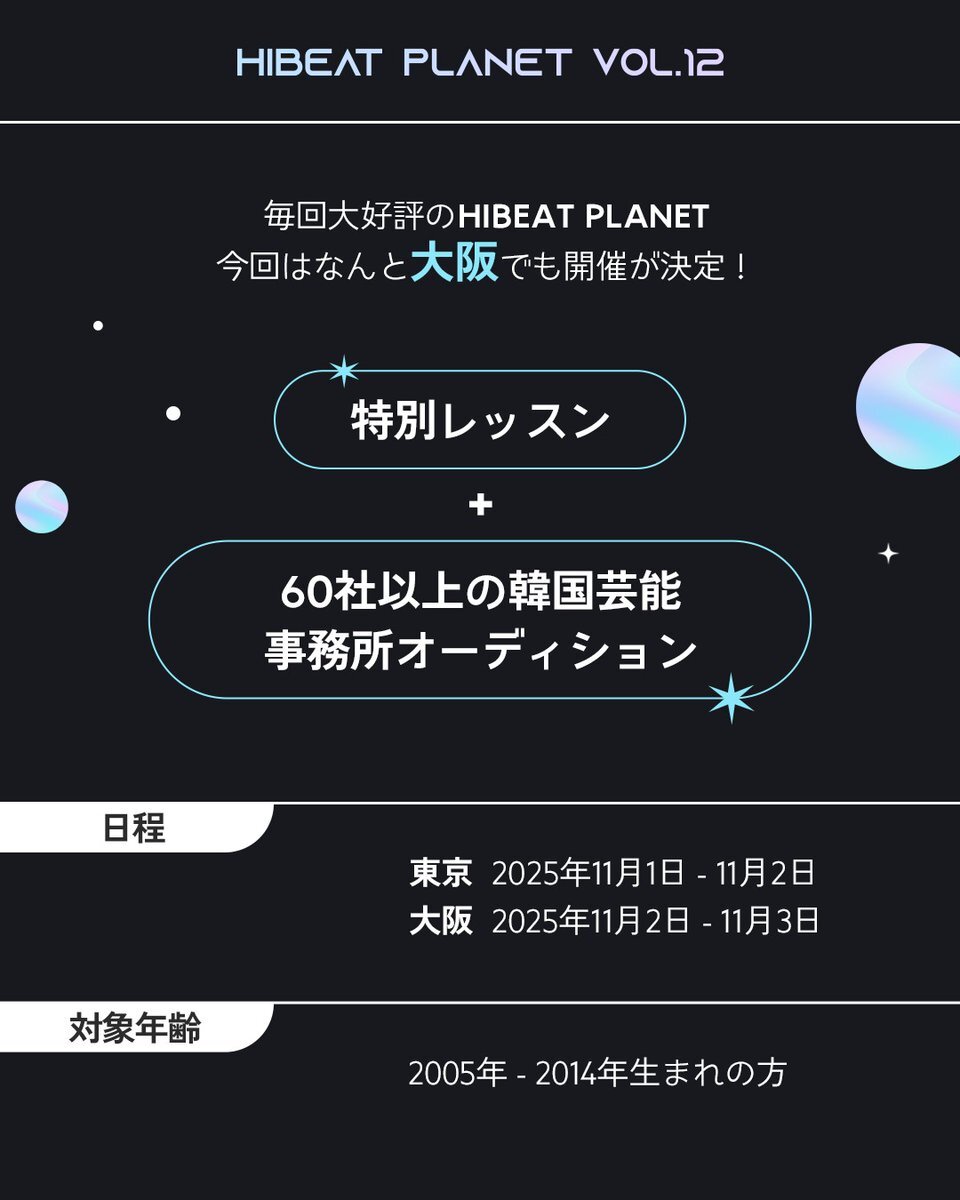 【NEW】HIBEAT PLANET Vol.12 【日程】 東京:2025年11/1~11/2 大阪:2025年11/2~11/3 【対象】2005年~2014年生まれの方 ・ダンスorボーカルレッスン ・コレオワークショップ ・韓国芸能事務所✨約60社以上✨オーディション 詳細と「特別割引」はリプ欄! #練習生になりたい #練習生になる #PR pic.x.com/MjDERnSdhg