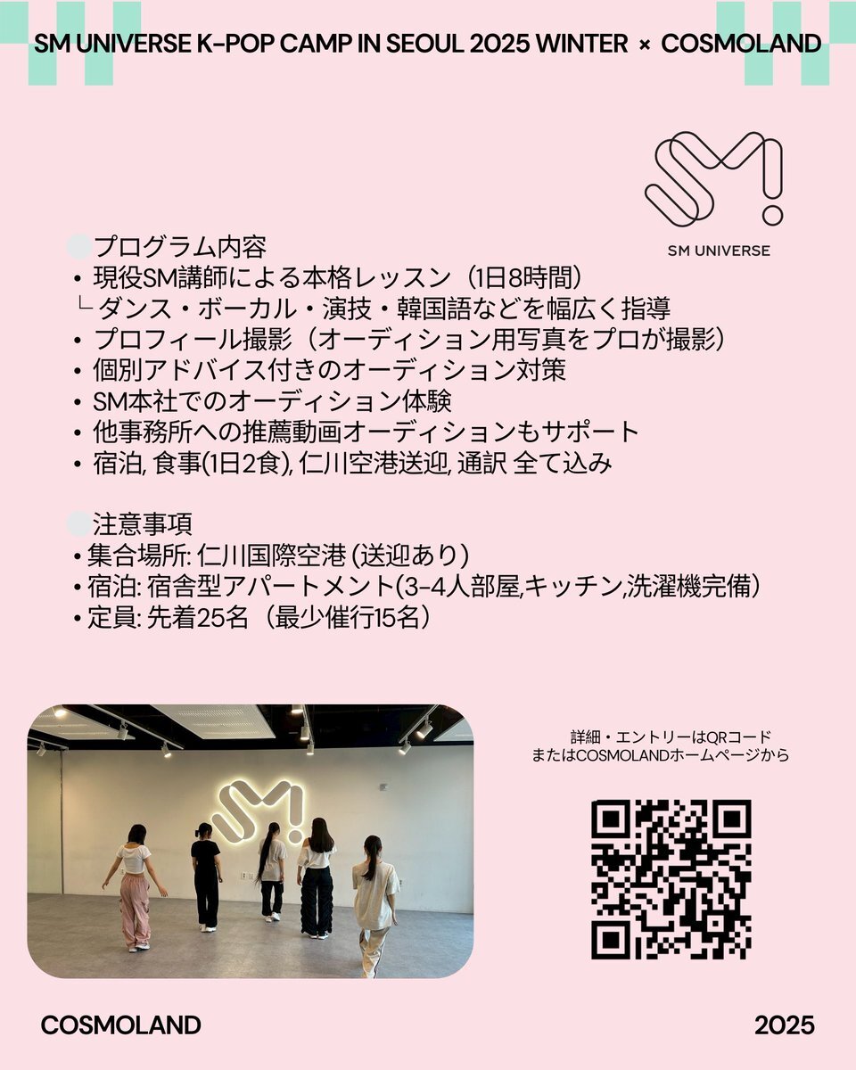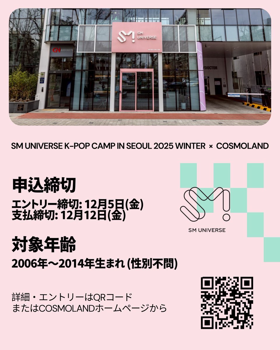 📣大好評だったK-POPキャンプが… ✨この冬も開催決定✨ 【SM UNIVERSE K-POP CAMP 2025 冬】 🗓️ 2025年12月22日〜12月28日 詳しくは↓ cosmoland-web.com/smcamp25w/ #練習生になりたい #kpop留学 #kpopキャンプ #kpopオーディション #sm #smentertainment #smuniverse #aespa #riize #heart2heart pic.x.com/AjWaUKd7Rv