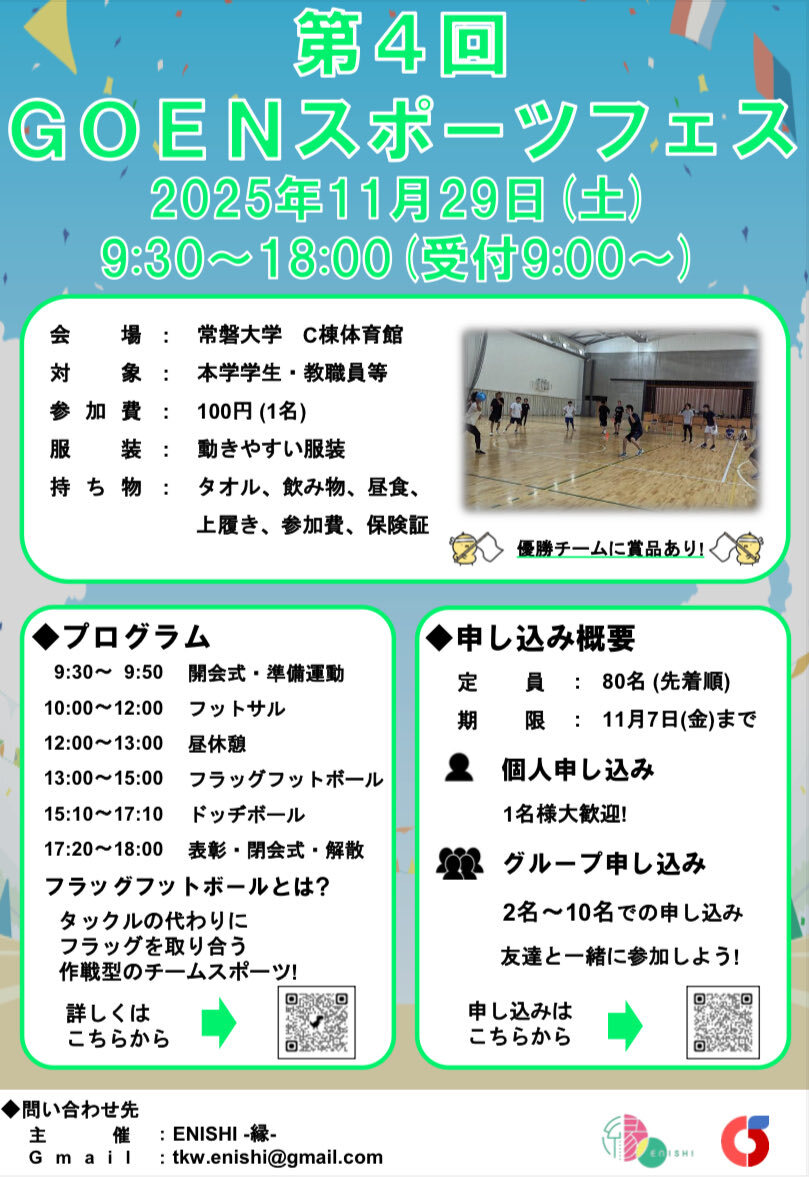 こんにちは🍎 この度第4回「GOENスポーツフェス」を開催します! 日時:11月29日(土) 会場:常磐大学C棟体育館 今回はグループでの申し込みも可能となってます❤️ たくさんのご参加お待ちしております🕺 【申込フォーム】 forms.gle/1AF3Sro6AcBYGw… #常磐大学 #常磐短期大学 #ENISHI # pic.x.com/97D3rWdBAi