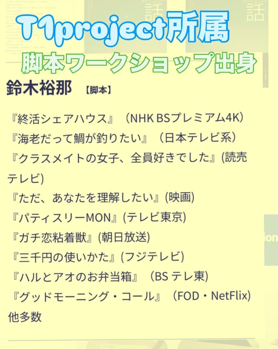 T1project所属・脚本家『鈴木裕那』の ご紹介✍️✨ 鈴木裕那が脚本を務めます ドラマ「就活シェアハウス」が NHK BSプレミアム4kにて絶賛放送中‼️ 現在TVドラマ等、様々な脚本を担当させて頂いている彼女は 『T1脚本・演出スタジオ』の出身。 ワークショップで一から学び、脚本家デビューしています。