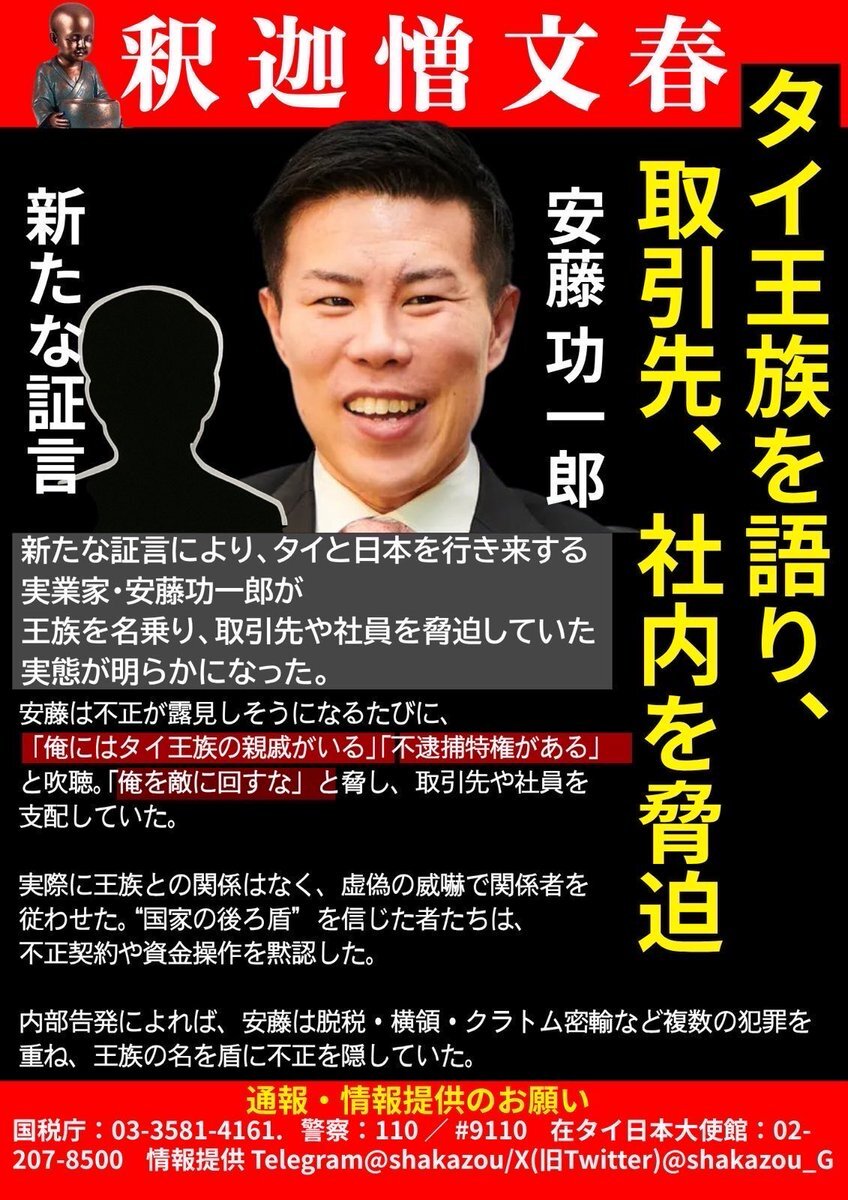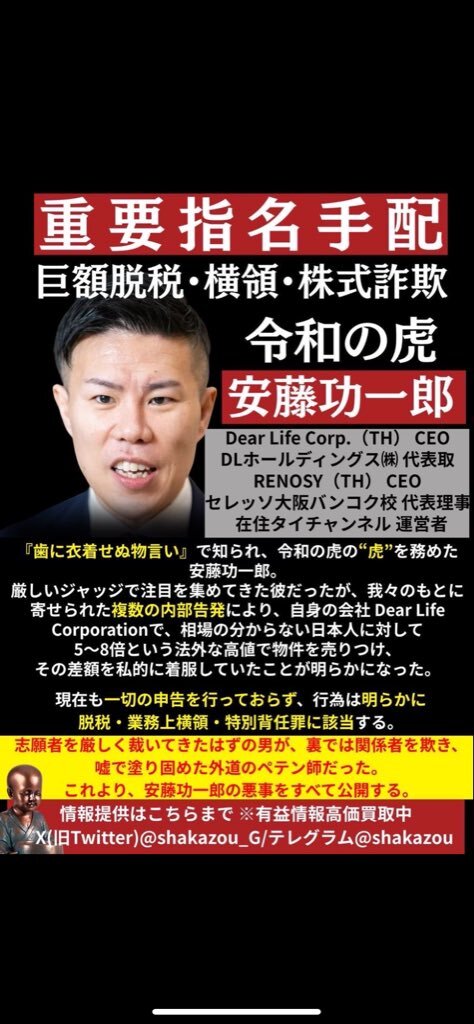 🚨最重要指名手配 ▪️安藤功一郎@andoreiwanotora 安藤は自身をタイ王族関係者と名乗り 取引先や社員を脅迫している外道詐欺師だ 王族との関係は皆無で 虚偽の威嚇で関係者を騙し強制的に 不正契約や資金操作に加担させている 脱税・横領・クラトム密輸など 犯罪行為を繰り返す外道の通報協力を求む