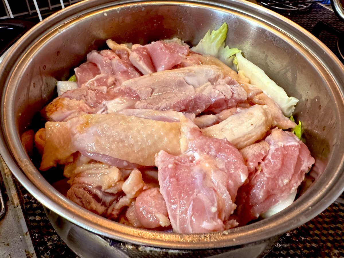 皮目に焼き目が付いたら一旦引き揚げます。 そこに白菜の芯側を引き詰めます。 そのに鶏肉を戻してその上に残りの白菜を入れます。 まだ全部入ってませんw 自分を信じろ! #夕飯作ってみた #自分を信じろ pic.x.com/OpwoS73J1x