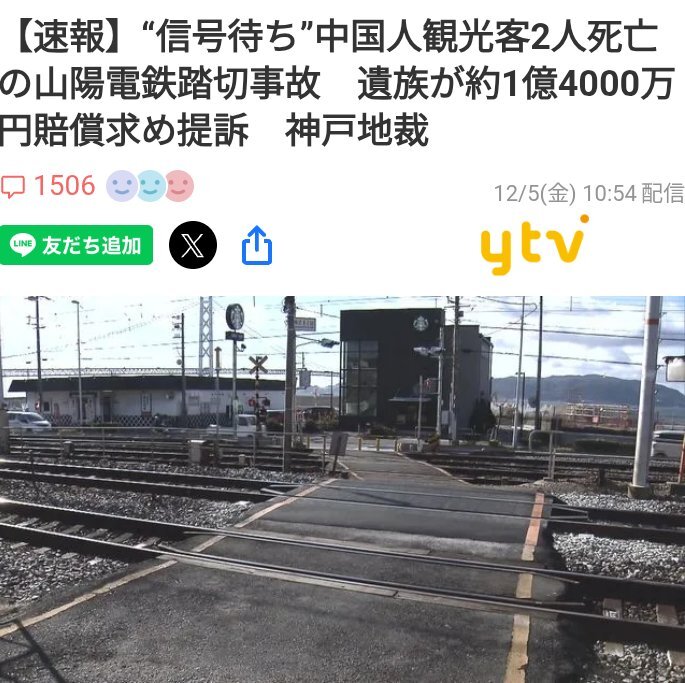 なんで遺族側が損害賠償請求してるの? 踏切に侵入した中国人の落ち度だろ。 むしろ事故の影響でダイヤが乱れた責任を負うべきだろ。 【速報】“信号待ち”中国人観光客2人死亡の山陽電鉄踏切事故 遺族が約1億4000万円賠償求め提訴 神戸地裁(読売テレビ) news.yahoo.co.jp/articles/29549…