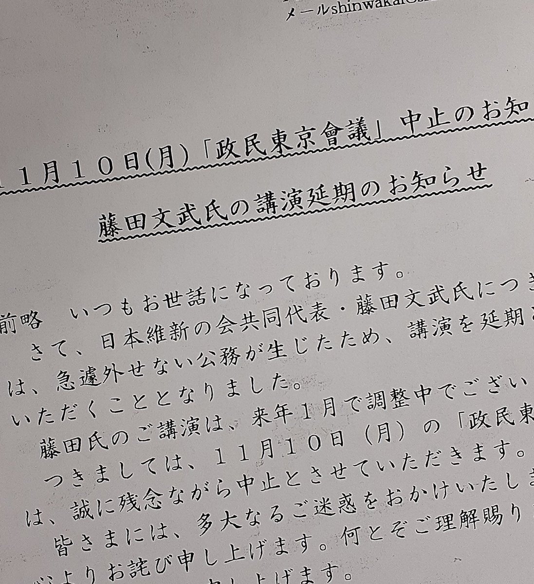 【画像】維新・藤田文武共同代表が、「公務」を理由に来月10日の講演を延期。主催者は「来年1月で調整中」だと説明しているので、事実上の中止だろう。質疑応答もある催しなので、「赤旗」日曜版のスクープが伝えた疑惑についての追及を避けたいのか?
