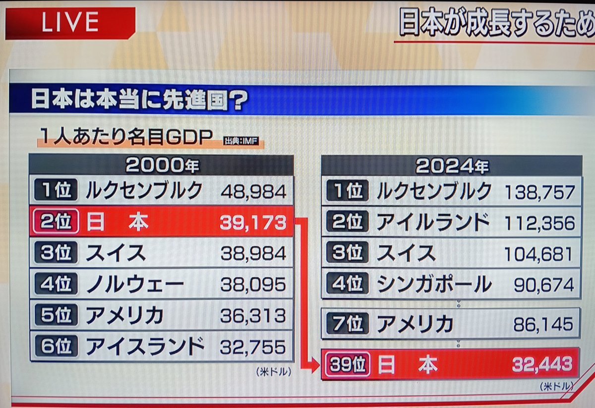 2000年と2024年のどちらも名前がある国は、どこも名目GDPが上がっているのに、#日本 だけ下がっている😱 労働者は、世界で唯一とも言われる「過労死」する位勤勉なのに😭 これは政治に問題がある以外に考えられない💢 #自民党に投票してはいけません #維新に投票してはいけません x.com/siroiwannko1/s…